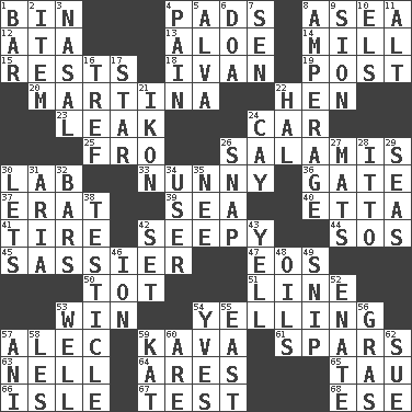 ACROSS 1. Storage container 4. Groovy apts. 8. Toward the sea 12. _ moment's notice (2 wds.) 13. _ vera 14. Place where flour is made 15. Musical pauses 18. _ the terrible 19. Mail 20. Chrissie's court nemesis 22. Layer 23. Path through which fluid escapes 24. Automobile 25. Back 26. Deli grouping 30. Experiment locale 33. Pet term 36. Yard entry 37. Part of Q.E.F. 39. Ocean 40. Singer James 41. Hoop that covers a wheel 42. Oozy 44. Mayday 45. More lively and spirited 47. Greek goddess of the dawn 50. Small child 51. Actor's bit 53. Victory 54. Crying or shouting loudly 57. Actor Baldwin 59. Polynesian shrub of the pepper family 61. Practice fights 63. 1994 drama film starring Jodie Foster 64. Ancient Greek god of war 65. The 19th letter of the Greek alphabet 66. Small island 67. Trial 68. Compass dir. DOWN 1. Tavern 2. A whole individual unit 3. Rhinal 4. Ache 5. Inventor's middle name 6. ___ good deed 7. Elected rep. 8. Electrical Measurement 9. The Jewish people; Israel 10. Raised railways 11. Keyboard modifier key 16. Unclean, religiously 17. Play the lead 21. Visual representation of an object 22. Actor Linden 24. Island 26. Fastener 27. Floor coverings 28. "Tell ____ the Marines!" 29. Oceans 30. Allows 31. Roberta Peters solo 32. Drinking establishments 34. One who uses or employs something 35. Born 38. One of the two male reproductive glands 42. Arrange properly for use 43. Shout 46. Electrically charged atom 48. Lubricates 49. Sever or remove by pinching or nipping 52. Related on the mother's side 53. Not ill 54. Jacques Cousteau's middle name 55. Compass direction 56. Pate de foie ____ 57. Cuckoo 58. French article 59. Krazy ___ of comics 60. "We ___ not amused" (Victoria) 62. Take to court