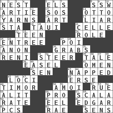 ACROSS 1. Egg locale 5. Raised railways 8. Compass dir. 11. Nick name for Arthur 13. Distress signal 14. Von Bismarck 15. Entertaining tales 16. Tate display 17. One who doesn't tell the truth 18. R.R. building 19. "Change" in Tahitian 21. Cell (Danish) 22. Adolescent 24. Hero or heavy, e.g. 25. Main course 27. Luau course 29. Soon (poet.) 30. Seizes 32. Painter Guido (1575-1642) 33. Guide 35. Story 39. Artist's stand 41. Sign of something about to happen 42. Elected rep. 43. Slept 45. Locales 48. Celtic language 49. Southeast Indonesia island 50. Mine, in Marseilles 52. Sorrow 55. Set down 56. Adept person 57. Any of the three canals of the cochlea 59. Assign a rank or rating to 60. Snakelike fish 61. _ Allan Poe 62. Personal Computers (abbr.) 63. Actress Charlotte 64. Elected reps. DOWN 1. Negative votes 2. Part of Q.E.F. 3. Ski resort town in Vermont 4. Metal container 5. Son of Isaac 6. Australian parrot (variant) 7. Fast jet (abbr.) 8. Not moving 9. Lacking originality or spontaneity 10. Had on 12. First name in cosmetics 14. Butter sub 20. A saturated hydrocarbon 21. Baby bed with high sides 23. Bert's buddy 25. Hearing organ 26. Compass dir. 27. Before (prefix) 28. Rowing implement 30. Set 31. Constricts 33. Compass dir. 34. "___ Little Indians" 36. Electrical Measurement 37. Area sheltered from the wind 38. Conclusion 40. SW Saudi Arabia district 43. Modern: prefix 44. Ascend 45. Pale purple color 46. Leaves out 47. ____ d'Azur (French Riviera) 49. Canvas cover 50. Type of rug 51. Undercover agent 53. ____ Bator 54. Hearing organs 56. For each 58. Music discs