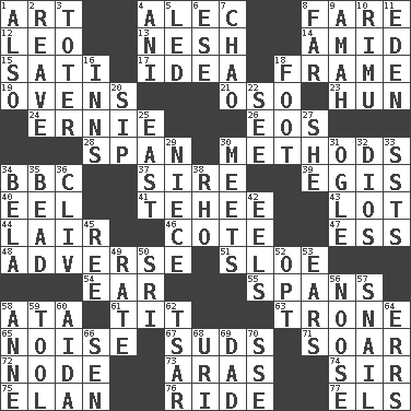 ACROSS 1. Tate display 4. Actor Baldwin 8. Conductor's collection 12. Lion 13. Tender 14. Among 15. Suttee (variant) 17. The main thing one is thinking about 18. Movie unit 19. Baking chambers 21. Bear (Spanish) 23. Attila the _ 24. Bert's buddy 26. Greek goddess of the dawn 28. Connect, as a bridge 30. Modes 34. English channel? 37. Beget 39. The front part of a cuirass 40. Snakelike fish 41. Giggle 43. Car dealer's back yard 44. Den 46. ____ d'Azur (French Riviera) 47. Curvy letter 48. Contrary to your interests or welfare 51. _ gin 54. Hearing organ 55. Connects, as a bridge 58. _ moment's notice (2 wds.) 61. Teat (slang) 63. Heavy duty weighing machine 65. Annoying sound 67. Beer foam 71. Fly high 72. Thickened enlargement 73. Caspian sea tributary 74. Title for a knight 75. Enthusiasm 76. Travel on or in a vehicle 77. Raised railways DOWN 1. In addition 2. Rob, plunder, or pillage 3. Carrier 4. Cuckoo 5. Directed 6. Compass dir. 7. US Secretary of Labor Elaine L. _ 8. Distant 9. Nursemaid 10. Tall New Zealand timber tree 11. Paradise 16. Taverns 18. Pick up the tab 20. Small drink 22. Perceive with the eye 25. Compass direction 27. A female animal or person 29. Sibling's daughter 30. Confronts 31. Stare 32. "Vaya con ____" 33. Fast planes 34. Actor Lugosi 35. Necklace unit 36. 154 in Roman numerals 38. 17th letter of the Greek alphabet 42. Snakelike fish 45. Portuguese money of account (variant) 49. Pace 50. Indian title of respect (Mr.) 52. Elect 53. Hearing organs 56. Trap for birds or small mammals 57. Slow-paced one 58. Singer Murray 59. Implement 60. Opera by Verdi 62. Russian ruler of old 64. Blunders 66. Elected rep. 68. RI univ. 69. Male parent 70. Compass dir.