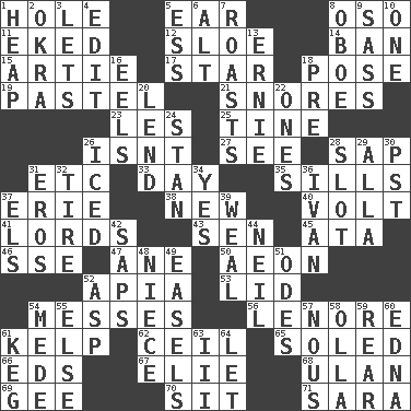 ACROSS 1. Hollow 5. Ewer handle 8. Bear (Spanish) 11. Supplemented with great effort 12. A type of plum 14. Forbid 15. Nick name for Arthur 17. Play the lead 18. Introduce or present, as a question 19. Soft color 21. Sounds asleep 23. French article 25. Prong on a fork 26. Is not 27. Perceive with the eye 28. Plant excrement 31. And so on (abbr.) 33. 24 hours 35. Beverly of Met fame 37. 4th largest of the Great Lakes 38. ___ Haven, CT 40. Electrical Unit 41. Nobles 43. Elected rep. 45. "One Day ___ Time" 46. Compass dir. 47. A saturated hydrocarbon 50. Age 52. Capital of Western Samoa 53. Hat (slang) 54. Makes clutter 56. Poe poem 61. Seaweed 62. To provide with a ceiling 65. Having a sole or soles 66. Begley and Asner 67. Writer Wiesel 68. ____ Bator 69. Turn to the right 70. Be seated 71. "Two Mules for Sister ____" DOWN 1. Pile 2. Gumbo ingredient 3. Allows 4. Prepare for publication 5. Double-curved letter 6. The first octave above the treble staff 7. Exposes to great heat 8. Mitch Miller's instrument 9. Backtalk 10. Single 13. Bert's buddy 16. Snakelike fish 18. Before (prefix) 20. Grant temporary use of 22. Singles 24. Comedian Laurel of Laurel & Hardy 26. On the rocks 28. Slit 29. Silent film actress Nazimova 30. Pacific Standard Time (abbr.) 31. Greek god of love 32. Become fatigued 34. Consenting reply 36. _ the terrible 37. Raised railways 39. Welt 42. Plant excrements 44. Famous astronaut Armstrong 48. Sibling's daughter 49. Artist's stands 51. Lyric poems 52. Cleo's killer 54. Ancient Persian 55. Otherwise 57. Common sense 58. Water jar 59. Buttocks 60. Pulitzer Prize-winning author Ferber 61. Barrel 63. One more than two 64. Allow