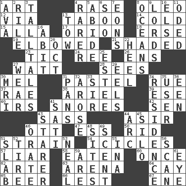 ACROSS 1. Nonscientific branch of learning 4. Raze (variant) 8. Margarine 12. By way of 13. Off limits 14. Lacking warmth 15. Silent film actress Nazimova 17. Constellation of myth 18. Celtic language 19. Turned at an angle; bent 21. Cast a shadow over 23. Nervous spasm 24. To sift 26. Followers of ems 27. Electrical Unit 28. Perceives with the eye 30. Cartoonist voice _ Blanc 31. Soft color 34. Sorrow 37. Actress Charlotte 38. Satellite of Uranus 39. Compass dir. 40. Big collection agency 41. Sounds asleep 42. Elected rep. 43. Backtalk 44. SW Saudi Arabia district 46. Baseball player Mel 47. Double-curved letter 50. To free from 51. Put through a sieve 54. Winter's stalactites 57. One who doesn't tell the truth 58. Eroded 60. At one time in the past 62. Johnson of "Laugh-In" 63. Sports stadium 64. Island 65. Fermented drink made from hops 66. For fear that 67. Compass dir. DOWN 1. Actress Gardner 2. Cause heat under the collar 3. Baron Munchausen's specialties 4. More valued for its uncommonness 5. Tolerate 6. "Barney Miller" actor Jack 7. Immeasurably long periods of time 8. Seas 9. Nobles 10. Otherwise 11. Wrote a lyric poem 13. Pull behind 16. "This won't hurt ____!" 20. Sep. follower 22. The bottom of a shoe or boot 25. First name in cosmetics 27. Erode 29. Snakelike fish 30. Medical imaging device (abbr.) 31. Baking dishes 32. Came up 33. Title for a knight 34. Home 35. One who makes use of a thing 36. Car or cant ending 41. Suttee (variant) 43. A viewer who gazes fixedly 44. Curve 45. Grain storage tower 46. Speak pompously 48. Locates 49. Aroma 51. Broad, flat, thick piece 52. Hoop that covers a wheel 53. Actress Patricia 55. _ tizzy (2 wds.) 56. Glance over 59. "We ___ not amused" (Victoria) 61. Sight organ