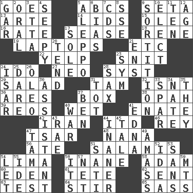 ACROSS 1. Travels 5. Lettered men learn these first 9. Stalk of a moss capsule 13. Johnson of "Laugh-In" 14. Flaplike coverings 15. Cassini of fashion 16. Pace 17. Gospel singer Marvin 18. French philosopher Descartes 19. Portable computers 21. And so on (abbr.) 22. Sharp bark 23. In a ____ (agitated or irritated) 24. Wedding promise 27. Modern: prefix 28. System (abbr.) 29. First course 31. Scottish cap 32. Is not 36. Ancient Greek god of war 37. Gift holder 38. Brightly colored fish 39. Vintage cars 40. Soggy 41. Maternal 42. SW Asia republic 44. It would 46. Marina Del _, California 47. Russian ruler of old 48. Nanny 50. Had dinner 51. Deli grouping 54. Pale green bean 56. Silly 58. First of billions? 60. Paradise 61. False hair 62. Transmitted 63. Trial 64. Use a swizzle stick 65. Backtalk DOWN 1. Slender fish 2. Spoken 3. Singer James 4. Oozy 5. City in Syria 6. Prejudice 7. Music discs 8. Compass dir. 9. Making a chance decision by using lots 10. Choose 11. "___ Little Indians" 12. Mature 17. Flatfish 20. Look after 21. Followers of ems 23. Symbol (abbr.) 24. Austrian river, tributary to the Danube 25. Have the gumption 26. Margarine 28. Saxophone 30. Aide 31. Small child 33. Practice fight 34. Nathan's nickname 35. Those people 37. Benjamin's nick name 40. Armed conflict 41. Pulitzer Prize-winning author Ferber 43. Actress Charlotte 44. More empty; more void 45. Story 47. Softens 49. Collect or gather 51. Suttee (variant) 52. The main thing one is thinking about 53. Without 54. Allow 55. Binary compound 56. It is 57. Fish or hair follower 59. Mountains (abbr.)