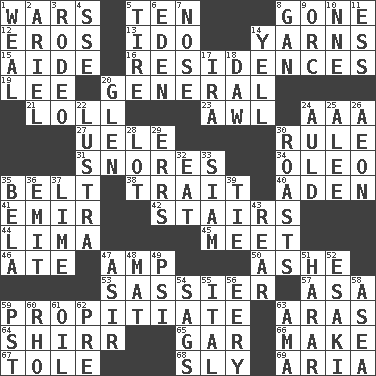 ACROSS 1. Armed conflicts 5. Nine, plus one 8. Went 12. Greek god of love 13. Wedding promise 14. Tall tales 15. Helper 16. Dwellings 19. Area sheltered from the wind 20. Commissioned military rank 21. Hang loosely or laxly 23. Leather borer 24. Auto club (abbr.) 27. Ubangi River tributary 30. General guideline 31. Sounds asleep 34. Butter sub 35. Waist strap 38. Distinguishing feature 40. An important port of Yemen 41. Independent ruler or chieftain 42. Flight of steps 44. Pale green bean 45. Confront 46. Had dinner 47. Electrical Unit 50. American tennis player Robert 53. More lively and spirited 57. White ___ sheet 59. Appease 63. Caspian sea tributary 64. Bake eggs in their shells 65. Slender fish 66. Cause to be 67. Lacquered or enameled metalware 68. Insidious 69. Operatic vocal solo DOWN 1. Welt 2. Satellite of Uranus 3. Cowboy competition 4. Compass dir. 5. Become fatigued 6. Paradise 7. Characteristic smell of wine 8. Separate the seeds from cotton 9. The grampus (Milton) 10. Compass dir. 11. Double-curved letter 14. Shout 17. Lyricist Gershwin 18. Fool 20. Small, secluded valley 22. A period of five years 24. Old (Scot.) 25. Toward shelter 26. Period of immesurable duration 28. Car dealer's back yard 29. Blunders 30. Exposes to great heat 32. Erode 33. Thailand, formerly 35. Actor Lugosi 36. Give off 37. Welles in "The Third Man" 39. Neckwear 43. Rump 47. SW Saudi Arabia district 48. Floor protector 49. Air pressure measure (abbr.) 51. Ethiopian city, capital of Harari 52. 1973 Nobel Price Winner (Physics) Leo 54. Sinks 55. Slanted text style (abbr.) 56. Suggestive of the supernatural 58. At sea 59. Pacific Standard Time (abbr.) 60. 17th letter of the Greek alphabet 61. Lubricate 62. Before (prefix) 63. Nanny (var.)