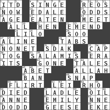 ACROSS 1. It would 4. Scorch 9. Vintage cars 13. Immediately 14. Peak District village in England 15. Likelihood 16. Grow older 17. Eroded 18. Confront 19. 100% 21. Layer 22. Make improvements or corrections to 24. _ and Stitch 26. "Barney Miller" actor Jack 27. Place in a line 29. Bar bills 30. Music written for nine 31. Neighbor of Neb. 33. Head covering 36. Coat; cloak 37. Deli grouping 40. Period 41. ___ a Wonderful Life 42. Went 43. Stories 45. Collude with 47. Assad's deity 48. Prohibit 49. Fastener 50. Talk or behave amorously 52. Flowery wreath 54. 17th letter of the Greek alphabet 56. Passed on 57. Dipping utensil 59. Petroleum 61. Singer Murray 62. Poet Dickinson 63. Compass dir. 64. Texas town _ City 65. Honkers 66. Make supply last DOWN 1. _ tizzy (2 wds.) 2. Ancient Roman robe 3. Residences 4. Observe 5. Potato state 6. Nathan's nickname 7. Small, secluded valley 8. Car or cant ending 9. Lover boys 10. Paradise 11. Wrote a lyric poem 12. Fast jet (abbr.) 20. Actor's bit 22. 1973 Nobel Price Winner (Physics) Leo 23. Disorderly crowd 25. Allows 27. Opposed to 28. Spoils 29. Not wild 31. Notch 32. One of the 12 tribes of Israel 33. Portable communications device 34. Type of rug 35. Romantic infatuation 38. Rep 39. Comedian Laurel of Laurel & Hardy 44. Having or resembling wings 45. Remained 46. Soap unit 49. Beverly of Met fame 50. Fine (Spanish) 51. Grant temporary use of 52. Unable to walk 53. Singer Brickell 55. Pig sound 56. June honoree 57. Part of a journey 58. Sight organ 60. Area sheltered from the wind