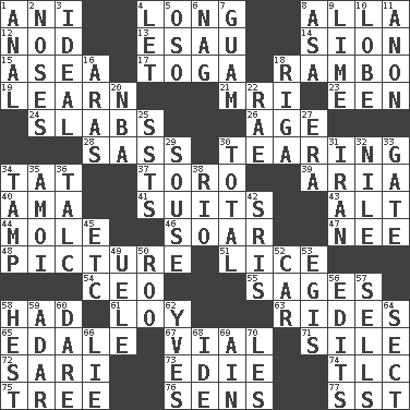 ACROSS 1. Cuckoo 4. Having great length 8. Silent film actress Nazimova 12. Allow head to fall sleepily 13. Son of Isaac 14. The Jewish people; Israel 15. Toward the sea 17. Ancient Roman robe 18. Role for Stallone 19. Acquire or gain knowledge or skills 21. Medical imaging device (abbr.) 23. Car or cant ending 24. Broad, flat, thick pieces 26. Ripen 28. Backtalk 30. Pulling apart 34. Make lace 37. "Corrida" creature 39. Operatic vocal solo 40. Nursemaid (var.) 41. Sets or collections 43. The first octave above the treble staff 44. Undercover agent 46. Fly high 47. Born 48. Photo 51. Louse (plural) 54. Corporate head (abbr.) 55. Gurus 58. Possessed 61. Myrna of the movies 63. Amusement-park features 65. Peak District village in England 67. Small bottle 71. Filth; sediment 72. Indian skirt 73. Singer Brickell 74. Affectionate concern, for short 75. Woody plant 76. Elected reps. 77. Fast jet (abbr.) DOWN 1. Of or related to the anus 2. Olfactory organs 3. Standard of perfection 4. Allow 5. Bear (Spanish) 6. Tired old horse 7. Island territory of the United States 8. White ___ sheet 9. Welles in "The Third Man" 10. Ear part 11. Soon (poet.) 16. Caspian sea tributary 18. Port city in Latvia 20. Basketball assoc. 22. Actress Charlotte 25. Fast planes 27. Period 29. Boozer 30. Add up to 31. SW Asia republic 32. Mediterranean tributary 33. Yard entry 34. Pack (down) 35. Mine, in Marseilles 36. Baby powder 38. _ de Janeiro 42. Indian titles of respect 45. And so on (abbr.) 49. Ubangi River tributary 50. Friend of Pooh 52. Auto 53. The front part of a cuirass 56. Proofreads 57. Exchanges for money 58. Behest 59. The sixth month of the Jewish calendar 60. Have the gumption 62. Jacques Cousteau's middle name 64. Religious group 66. Untruth 68. Binary compound 69. The 18th letter of the Arabic alphabet 70. French article