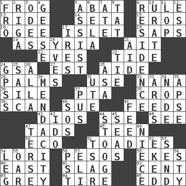 ACROSS 1. Tree-dwelling hopper 5. Blind as ____ 9. Governing power 13. Travel on or in a vehicle 14. Stalk of a moss capsule 15. Greek god of love 16. Double curve, resembling the letter S 17. Small island 18. Plant excrements 19. Nineveh was its capital 21. Small island 22. Nights before holidays 23. Periodic rise and fall of the sea level 24. Girls' org. (abbr.) 27. Eastern Standard Time (abbr.) 28. Assistant 29. Insides of hands 31. Purpose 32. Grandmother 36. Drop; flow; fall 37. Parent Teacher Association (abbr.) 38. Riding implement 39. Glance over 40. Take to court 41. Eats 42. "Vaya con ____" 44. Compass dir. 46. Observe 47. Bits 48. Adolescent 50. Environmental prefix 51. Sycophants 54. Australian parrot (variant) 56. Mexican monetary units 58. Supplements with great effort 60. Compass direction 61. Volcanic refuse 62. Penny 63. Jennifer or Joel 64. Become fatigued 65. Whirlpool DOWN 1. Back 2. Port city in Latvia 3. Lyric poems 4. Honkers 5. Aid 6. Actor Lugosi 7. Had dinner 8. Make lace 9. Dwelling 10. A salt of uric acid 11. Chop off 12. Double-curved letter 17. Angers 20. Jacques Cousteau's middle name 21. Help 23. Make a knot 24. Global Positioning Systems (abbr.) 25. Ketch in the Levant 26. Silent film actress Nazimova 28. White ___ sheet 30. Ananias' fault 31. Shoshoni 33. Ancient Greek god of war 34. Connecting point 35. Domed church section 37. Tenth month of the Hindu calendar 40. Distress signal 41. Nourish 43. Wedding promise 44. Moe Howard, for one 45. Oceans 47. Laconic 49. Sibling's daughter 51. Russian ruler of old 52. Made supply last 53. Post 54. Part of a journey 55. Boat paddle 56. Pacific Standard Time (abbr.) 57. Connecticut Ivy Leaguer 59. Filthy place