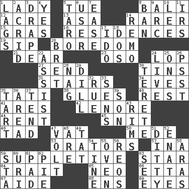 ACROSS 1. Kenny Rogers chart-topper in '80 5. Third day of the wk. 8. Indonesian resort city 12. Land measure 13. White ___ sheet 14. Less widely known 15. Pate de foie ____ 16. Homes 19. Small drink 20. Mood resulting from idleness 21. Letter starter 23. Bear (Spanish) 24. Trim (branches) 27. Transmit 30. Metal containers 31. Flight of steps 34. Nights before holidays 35. Jacques of French films 38. Adhesives 40. Respite 41. Ancient Greek god of war 42. Poe poem 44. Monthly bill 45. In a ____ (agitated or irritated) 46. Bit 47. Large container 50. Ancient Persian 53. Speakers 57. _ tizzy (2 wds.) 59. Supplementary 63. Play the lead 64. Distinguishing feature 65. Modern: prefix 66. Singer James 67. Helper 68. Followers of ems 69. Sight organs DOWN 1. Straggles 2. Bitter 3. Window treatment 4. Consenting reply 5. Pacific island yam 6. One who uses or employs something 7. Relaxation 8. Bar 9. Curve 10. Area sheltered from the wind 11. Big collection agency 14. San ____ (Riviera town) 17. Wedding promise 18. Two (Sp.) 20. Cy Young winner Saberhagen 22. Help 24. Not recorded 25. Singles 26. Inconspicuous attention getter 28. Tired old horse 29. Deli pickle 30. Cylindrical with tapered ends 32. Regret 33. Elected reps. 35. Small pie 36. Length times width 37. Watch over 39. Male offspring 43. Basketball hoops 47. Electrical Unit 48. "We ___ not amused" (Victoria) 49. Make lace 51. Simple song 52. Maternal 54. Prong on a fork 55. Baking chamber 56. Vintage cars 58. Ancient river in northeast Turkey 59. R.R. building 60. RI univ. 61. Writing tablet 62. Sliced dessert 63. Observe