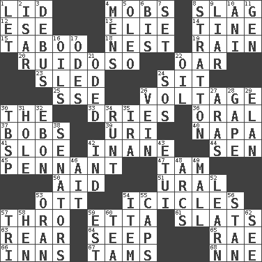 ACROSS 1. Hat (slang) 4. Disorderly crowds 8. Volcanic refuse 12. Compass dir. 13. Writer Wiesel 14. Prong on a fork 15. Off limits 18. A home for chicks 19. Water falling in drops from the sky 20. Boisterous (Brazilian Portuguese) 22. Rowing implement 23. Downhill vehicle 24. Be seated 25. Compass dir. 26. Electrical Measurement 30. Definite Article 33. Frees from moisture 36. Relating to the mouth 37. Moves up and down 39. RI univ. 40. California wine valley 41. A type of plum 42. Empty; void 44. Elected rep. 45. Pre-World Series prize 47. Scottish cap 50. Assist 51. Mountain range 53. Baseball player Mel 54. Winter's stalactites 57. Through, poetically 59. Singer James 61. Narrow boards 63. Buttocks 64. Ooze 65. Actress Charlotte 66. Restaurants 67. Scottish caps 68. Compass dir. DOWN 1. Allow 2. Austrian river, tributary to the Danube 3. Alight from a bus 4. Not women's 5. Margarine 6. Again 7. Arrange properly for use 8. Ski resort town in Vermont 9. One who doesn't tell the truth 10. Cuckoo 11. Commissioned military rank (abbr.) 16. Petroleums 17. Lyric poems 21. Wrote a lyric poem 22. Petroleum 24. Distress signal 26. Distinctive style or manner 27. Ancient river in northeast Turkey 28. Stare wonderingly 29. Enthusiasm 30. Cook's measure (abbr.) 31. Hollow 32. Inky black, to poets 34. The smallest animal of a litter 35. Lyricist Gershwin 38. Legislators 42. Working for oneself (abbr.) 43. Needle holder 46. Small island 48. Arches 49. Promenade 52. Acquire or gain knowledge or skills 53. NW Algerian seaport 54. Detail 55. Balmoral and tarboosh 56. Comedian Laurel of Laurel & Hardy 57. Three (prefix) 58. Layer 59. Eastern Standard Time (abbr.) 60. Afternoon social gathering 62. Perceive with the eye