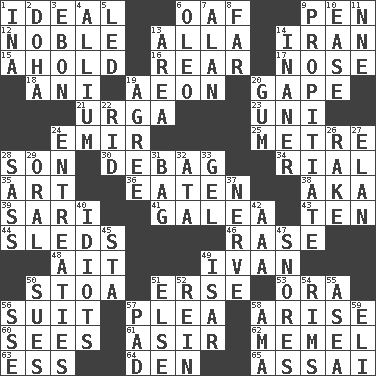 ACROSS 1. Perfect 6. Clumsy lout 9. Writing instrument 12. Impressive in appearance 13. Silent film actress Nazimova 14. SW Asia republic 15. Hold, grip (Informal) 16. Bring up, as a child 17. Sense of smell 18. Black tropical American cuckoo 19. A really long time 20. Open wide 21. Capital and largest city of Mongolia 23. Corn or form start 24. Independent ruler or chieftain 25. Distance measurement (Brit.) 28. Boy, to dad 30. Debunk (Brit. slang) 34. Monetary unit of Yemen 35. Nonscientific branch of learning 36. Consumed 38. Alias (abbr.) 39. Indian skirt 41. An organ shaped like a helmet 43. "___ Little Indians" 44. Bobsleighs 46. To erase 48. Small island 49. _ the terrible 50. Portico 51. Celtic language 53. Mouth or opening 56. Set or collection 57. Entreaty 58. Get up 60. Observes 61. SW Saudi Arabia district 62. Klaipeda city 63. Double-curved letter 64. Lair 65. Slender Brazilian palm DOWN 1. _ tizzy (2 wds.) 2. Capital of the state of Qatar 3. Inky black, to poets 4. Plant genus of onion and garlic 5. Directed 6. Butter sub 7. ____ Jay Lerner 8. Distant 9. Appease 10. Relaxation 11. Compass dir. 13. Length times width 14. Sillier 19. Match 20. Chewing product 22. To free from 24. Pleas 26. Libertine 27. Enthusiasm 28. Backtalk 29. Taken by mouth 31. Paper or plastic container 32. "One Day ___ Time" 33. Set 37. Effrontery 40. Foolish or stupid persons 42. Auto club (abbr.) 45. R.R. building 47. Sounds asleep 49. Austrian river, tributary to the Danube 50. Takes to court 51. Otherwise 52. It's straight from the horse's mouth 54. Basketball hoops 55. Toward the sea 56. Compass dir. 57. Writing tablet 58. Nanny (var.) 59. Biblical high priest