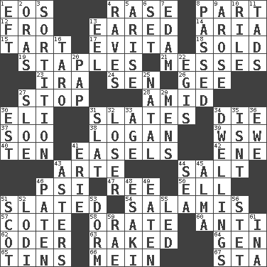 ACROSS 1. Greek goddess of the dawn 4. Raze (variant) 8. Piece 12. Back 13. Having ears or earlike features 14. Roberta Peters solo 15. Small pie 17. Webber/Rice musical 18. Disposed of to a purchaser 19. Paper fasteners 21. Makes clutter 23. Lyricist Gershwin 24. Elected rep. 26. Unit of force equal to gravity 27. Obstruct or block passage 28. Among 30. Biblical high priest 31. Chalkboards 34. Pass on 37. "Barney Miller" actor Jack 38. Utah city north of Ogden 39. Compass dir. 40. Nine, plus one 41. Artist's stands 42. Compass dir. 43. Johnson of "Laugh-In" 44. Table seasoning 46. 23rd letter of the Greek alphabet 47. To riddle 50. Pipe bend 51. Scheduled 54. Deli grouping 57. ____ d'Azur (French Riviera) 58. Speak pompously 60. Against 62. River in Europe 63. Moved through 64. Commissioned military rank (abbr.) 65. Canisters 66. Chow _ 67. R.R. building DOWN 1. Lizard (obsolete) 2. Mouths or openings 3. Drawing lots 4. All-night dance parties 5. Get up 6. Put into a specified state 7. Dutch treat 8. Went by 9. Came up 10. Cause heat under the collar 11. Small boys 13. Snakelike fish 16. Edible starchy tuberous root 20. Infant food 22. Armor plate that protects the chest 25. Brizilian seaport 27. A type of plum 29. Not women's 30. Eastern Standard Time (abbr.) 31. Narrow board 32. Failure 33. Grow older 34. Homes 35. Is not 36. She-sheep 41. One of the Great Lakes 43. Michaelmas daisies 44. Ocean 45. _ mater 46. Eucharist need 48. 1973 Nobel Price Winner (Physics) Leo 49. Ingested 51. Highlander 52. Farming town in central California 53. Dormintory (informal) 55. Directed 56. Proofreading order 59. Actress Charlotte 61. _ tizzy (2 wds.)
