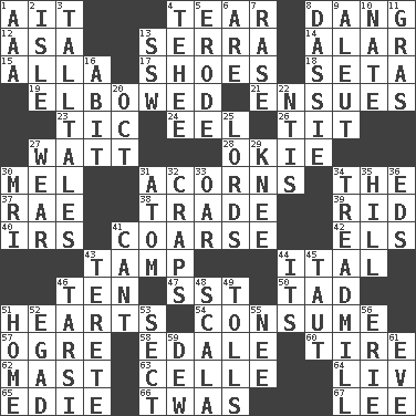 ACROSS 1. Small island 4. Lacerate 8. Mild oath, euphamism for damn 12. White ___ sheet 13. Spanish missionary in California 14. Having or resembling wings 15. Silent film actress Nazimova 17. Imelda's hoard 18. Stalk of a moss capsule 19. Shoved, as through a crowd 21. Follows as a consequence or result 23. Nervous spasm 24. Snakelike fish 26. Teat (slang) 27. Electrical Unit 28. Migrant worker of the '30s 30. Cartoonist voice _ Blanc 31. Oak nuts 34. Definite Article 37. Actress Charlotte 38. Swap 39. To free from 40. Big collection agency 41. Unrefined 42. Raised railways 43. Pack (down) 44. Slanted text style (abbr.) 46. "___ Little Indians" 47. Fast jet (abbr.) 50. Bit 51. Centers of feelings and intuitions 54. Eat 57. Legendary monster 58. Peak District village in England 60. Become fatigued 62. Vertical spar for supporting sails 63. Cell (Danish) 64. 54 in ancient Rome 65. Singer Brickell 66. It was, poetically 67. Area sheltered from the wind DOWN 1. Auto club (abbr.) 2. Capri or Wight 3. Baron Munchausen's specialties 4. Giggle 5. Wear away 6. "We ___ not amused" (Victoria) 7. To erase 8. Hyrax 9. Eskimo relative 10. Nathan's nickname 11. Pate de foie ____ 13. Compass dir. 16. "This won't hurt ____!" 20. Sep. follower 22. Nuclear Threat Initiatives 25. Domineers 27. Erode 29. Leg joint 30. Medical imaging device (abbr.) 31. Tiny particle 32. Dice game 33. Rowing implement 34. Excercise machine 35. Land elevation 36. Begley and Asner 41. Patter 43. Cylindrical with tapered ends 44. ___ a Wonderful Life 45. Tense 46. Tarsus (plural) 48. Any of the three canals of the cochlea 49. For Whom the Bell _____ 51. Dwelling 52. Mild oath 53. Religious group 55. Born 56. One of the Great Lakes 59. Morning condensation 61. Night before a holiday
