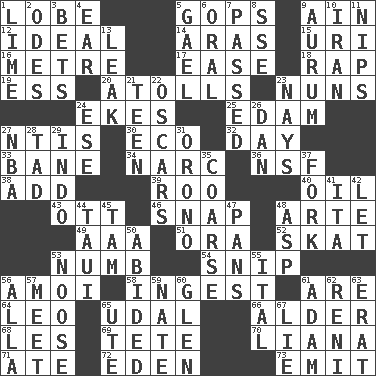 ACROSS 1. Ear part 5. Republicans 9. The 18th letter of the Arabic alphabet 12. Perfect 14. Caspian sea tributary 15. RI univ. 16. Distance measurement (Brit.) 17. Relaxation 18. Reproach for some lapse or misdeed 19. Curvy letter 20. Ringlike coral islands and reefs 23. Religious women 24. Supplements with great effort 25. Dutch treat 27. Nuclear Threat Initiatives 30. Environmental prefix 32. 24 hours 33. Object of repulsion 34. Drug cop 36. Overdraft (abbr.) 38. Increase 39. Friend of Pooh 40. Petroleum 43. Baseball player Mel 46. Fastener 48. Johnson of "Laugh-In" 49. Auto club (abbr.) 51. Mouth or opening 52. Three-handed card game 53. Unfeeling 54. Sever or remove by pinching or nipping 56. Mine, in Marseilles 58. Eat 61. "We ___ not amused" (Victoria) 64. Lion 65. Allodial 66. Tree or shrub in the Birch family 68. French article 69. False hair 70. Climbing, woody, usually tropical vines 71. Had dinner 72. Locale of original sin 73. Send forth DOWN 1. Welles in "The Third Man" 2. Lyric poems 3. Wagers 4. Hearing organ 5. Highlander 6. Relating to the mouth 7. Went by 8. Compass dir. 9. Gold (Symbol: Au) 10. SW Asia republic 11. Pinches, bites 13. Path through which fluid escapes 21. Adolescent 22. Motion picture awards 23. Negative votes 24. Compass dir. 26. One of the 12 tribes of Israel 27. Basketball assoc. 28. Small boy 29. Southeast Asian peninsula 31. U. of Maine site 35. Unrefined 37. Tined utensil 41. Call ___ day 42. Allow 44. "Change" in Tahitian 45. Scottish cap 47. Baking dishes 48. Cleo's killer 50. Tolerated 53. Trap for birds or small mammals 55. Slanted text style (abbr.) 56. Silent film actress Nazimova 57. Confront 59. Nathan's nickname 60. Small, secluded valley 61. First of billions? 62. Painter Guido (1575-1642) 63. Part of Q.E.F. 65. Shoshoni 67. Whopper