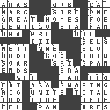 ACROSS 1. Ancient river in northeast Turkey 5. Globe 8. Feline 11. Drug cop 12. Father 14. Single 15. Relatively large 17. Residences 18. Enemy 19. Small, flat, pigmented spot on the skin 21. R.R. building 22. Avid follower 23. Mouth or opening 24. Before (prefix) 25. Shoshoni 27. One more than two 28. Snakelike fish 31. Remaining after all deductions 35. Compass dir. 37. Highlander 38. Mitch Miller's instrument 39. Thick or sticky substance 41. Ballerina skirt 42. Fly high 43. Indian title of respect (Mr.) 45. Connect, as a bridge 46. Extremities 47. Epoch 49. Put into a specified state 51. Experiment locale 52. Lion 55. Consume 57. White ___ sheet 60. Catching in a trap 62. River (Sp.) 63. Join together 65. "_____ Recall" 66. Wedding promise 67. Periodic rise and fall of the sea level 68. Wig 69. Snakelike fish 70. Baking dish 71. Ancient Greek god of war DOWN 1. White American of non-Hispanic descent 2. Less widely known 3. Sports stadium 4. Jazz singing style 5. Bear (Spanish) 6. Basketball hoops 7. Cy Young winner Saberhagen 8. Java holder (2 wds.) 9. Small Philippine buffalo 10. Adolescent 13. Son of Isaac 16. Native american tent (variation) 17. Cultivating 20. Broad smile 26. Trials 29. Globular water bottle used in Asia 30. Surprise greatly 31. Characteristic smell of wine 32. Inky black, to poets 33. Inedible or poisonous agaric 34. Laconic 36. Greek goddess of the dawn 40. Threatening words 44. SW Asia republic 48. Blind as ____ 50. Tense 52. 61 cubic inches 53. Maternal 54. Stares at amorously 55. 4th largest of the Great Lakes 56. Assistant 58. Sever or remove by pinching or nipping 59. Opera by Verdi 61. Roll call or roster of names 64. Nine, plus one