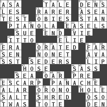 ACROSS 1. White ___ sheet 4. Story 8. Habitations of wild animals 12. French article 13. More valued for its uncommonness 14. Toward the sea 15. Trial 17. Off-Broadway awards 18. Comedian Laurel of Laurel & Hardy 19. Player piano 21. Artist's stands 23. Institute legal proceedings 24. Conclusion 26. Compete 27. "Tell ____ the Marines!" 28. Writer Wiesel 30. Epoch 31. Spoke pompously 34. Distant 37. Elected rep. 38. Music written for nine 39. Actress Gardner 40. Fast jet (abbr.) 41. Spring feasts 42. Mouth edge 43. Flexible conduit 44. Backtalk 46. Ocean 47. Boat paddle 50. Before (prefix) 51. Fortification 54. Flamboyance 57. Having or resembling wings 58. U. of Maine site 60. Hollow 62. Table seasoning 63. Fragment 64. Bear (Spanish) 65. It was, poetically 66. Carryall 67. Lair DOWN 1. Keyboard modifier key 2. Ooze 3. Helper 4. Eating place 5. Believer in; advocate of (suffix) 6. Area sheltered from the wind 7. Celtic language 8. Small ungulate mammals of Africa 9. First name in cosmetics 10. Actress Patricia 11. Without 13. Friend of Pooh 16. Strained 20. Modern: prefix 22. Enthusiastic 25. Prevent from occurring 27. Angers 29. Allows 30. Double-curved letter 31. Washington bills 32. Cowboy competition 33. A saturated hydrocarbon 34. It jiggles the polygraph 35. Advice 36. Hit sharply and swiftly 41. Fly high 43. Centers of feelings and intuitions 44. Health resort 45. Bowlike part 46. Any of the three canals of the cochlea 48. To the left, to Queeg 49. The wife of a rajah (variant) 51. Compass direction 52. Cole _ (cabbage dish) 53. Mail 55. Dreamland 56. Otherwise 59. 17th letter of the Greek alphabet 61. A really long time