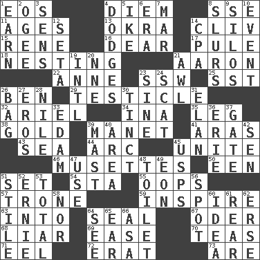 ACROSS 1. Greek goddess of the dawn 4. South Vietnam president (1954) 8. Compass dir. 11. Eras 13. Gumbo ingredient 14. 154 in Roman numerals 15. French philosopher Descartes 16. Letter starter 17. Whine 18. Nestling 21. Composer Copland 22. Queen of England 1702-14 23. Compass dir. 25. Fast jet (abbr.) 26. Benjamin's nick name 29. One of the two male reproductive glands 32. Satellite of Uranus 34. _ tizzy (2 wds.) 35. Part of a journey 38. Gilded 39. French painter Edouard 41. Caspian sea tributary 43. Ocean 44. Curve 45. Join together 46. French bagpipes 50. Car or cant ending 51. Put into a specified state 54. R.R. building 55. I made a mistake 57. Heavy duty weighing machine 59. Stimulate to action 63. To the inside or interior of 64. Lick closed 67. River in Europe 68. One who doesn't tell the truth 69. Relaxation 70. Afternoon social gatherings 71. Snakelike fish 72. Part of Q.E.F. 73. "We ___ not amused" (Victoria) DOWN 1. Merit 2. Double curve, resembling the letter S 3. Elected reps. 4. Evades 5. Mamie's husband 6. Period 7. Impair 8. Disparaging remarks 9. Grain storage towers 10. Happening 12. Bristle 14. Numbers guy (abbr.) 19. International (abbr.) 20. Compass dir. 21. Leather borer 23. Trig term 24. Leave at once 26. Container for groceries 27. Greek god of love 28. Mediterranean tributary 30. Tinged 31. Style 33. Dutch treat 36. One of the Great Lakes 37. Yard entry 39. Vertical spar for supporting sails 40. Length times width 42. Elected rep. 45. United States Postal Service (abbr.) 47. Purpose 48. Rest room 49. A really long time 51. Vertical member of a panel or frame 52. Bert's buddy 53. Add up to 56. Specific locale 58. Or not 60. The main thing one is thinking about 61. Posterior 62. Celtic language 64. Perceive with the eye 65. Ewer handle 66. White ___ sheet