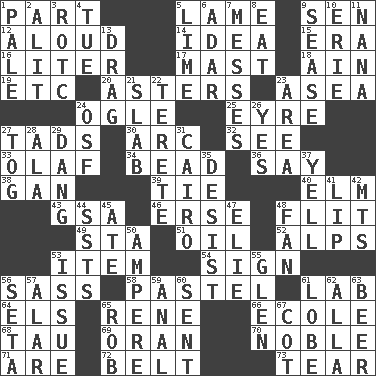 ACROSS 1. Role in a play 5. Unable to walk 9. Elected rep. 12. Verbally 14. It may be bright or harebrained 15. Period 16. 61 cubic inches 17. Vertical spar for supporting sails 18. The 18th letter of the Arabic alphabet 19. And so on (abbr.) 20. Michaelmas daisies 23. At sea 24. Stare 25. Jane of fiction 27. Bits 30. Curve 32. Perceive with the eye 33. Norwegian king 34. Necklace unit 36. Declare 38. Separate the seeds from cotton 39. Make a knot 40. Shade tree 43. Girls' org. (abbr.) 46. Celtic language 48. Sudden quick movement 49. R.R. building 51. Lubricate 52. High mountains 53. A whole individual unit 54. Omen 56. Backtalk 58. Soft color 61. Experiment locale 64. Raised railways 65. French philosopher Descartes 66. Learning spot: Fr. 68. The 19th letter of the Greek alphabet 69. Northwest Algerian city 70. Impressive in appearance 71. "We ___ not amused" (Victoria) 72. Waist strap 73. Pull into pieces DOWN 1. Diluted with white 2. Set down 3. College mil. group 4. Third day of the wk. 5. Welles in "The Third Man" 6. The sixth month of the Jewish calendar 7. Makes clutter 8. Ingest 9. Gospel singer Marvin 10. One of the Great Lakes 11. Grandmother 13. To trail on the ground 21. Broad, flat, thick piece 22. Cylindrical with tapered ends 23. Type of rug 24. Order of Saint Francis (abbr.) 26. Affirmative reply 27. Coat; cloak 28. In the manner of 29. Mild oath, euphamism for damn 31. Capital of Egypt 35. Stop 37. Shout 41. Mouth edge 42. Mountains (abbr.) 44. Fast planes 45. Had dinner 47. Writer Wiesel 48. Avid follower 50. Electrical Unit 53. Come out of 55. Small, secluded valley 56. Bristle 57. Having or resembling wings 59. Of or related to the anus 60. Emitted 61. Ear part 62. Silent film actress Nazimova 63. Fermented drink made from hops 65. Director Reiner 67. Small bed