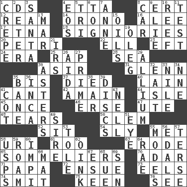 ACROSS 1. Music discs 4. Singer James 8. An absolute certainty 12. 480, 500 or 516 sheets of paper 14. U. of Maine site 16. Toward shelter 17. Inactive volcano in Sicily 18. Seigniories (variant) 20. _ dish (used to culture cells) 22. Pipe bend 23. Newt 24. Epoch 25. Strike 28. Ocean 30. SW Saudi Arabia district 31. American astronaut and politician John 35. Again 37. Passed on 40. (Had) reclined 41. Patter 42. With great haste 44. Small island 45. Single time 46. Celtic language 47. Shoshoni 48. Pulls into pieces 50. Clement's nick name 52. Be seated 54. Roguish 55. Was introduced to 58. RI univ. 61. Friend of Pooh 63. Wear away 65. Wine waiters 70. The sixth month of the Jewish calendar 71. Dad 72. Take place subsequently 73. Snakelike fish 74. Stricken, poetically 75. Peachy ____! 76. Observe DOWN 1. Streamer paper 2. Prevent from occurring 3. Before Barbara or Clara 4. Greek goddess of the dawn 5. Three (prefix) 6. Coat; cloak 7. Queen of England 1702-14 8. Auto 9. Writer Wiesel 10. Coral collection 11. Trial 13. Third mo. 15. Petroleums 19. Cassini of fashion 21. Big collection agency 26. Opera by Verdi 27. A-one 29. Plant genus of onion and garlic 30. Michaelmas daisies 32. Compass direction 33. Mediterranean tributary 34. Compass dir. 35. Object of repulsion 36. South American Indian 38. Hearing organ 39. Plates 41. Small bed 43. 1994 drama film starring Jodie Foster 49. Title for a man of rank and authority 51. Sight organ 53. Lacquered or enameled metalware 55. Methods 56. Peak District village in England 57. Laconic 58. United States Postal Service (abbr.) 59. Wander aimlessly 60. Body of Kaffir warriors 62. Pig sound 64. Actress Charlotte 66. Floor covering 67. Compass dir. 68. Sorrow 69. Elected rep.