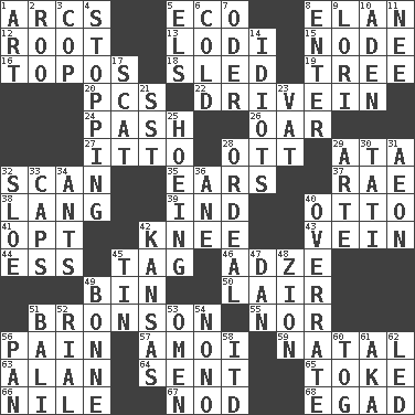 ACROSS 1. Curves 5. Environmental prefix 8. Flair 12. Carrot, for example 13. Farming town in central California 15. Connecting point 16. Literary convention 18. Downhill vehicle 19. Family _ (genealogy) 20. Personal Computers (abbr.) 22. Popular '50s hangout 24. Romantic infatuation 26. Rowing implement 27. "Tell ____ the Marines!" 28. Baseball player Mel 29. _ moment's notice (2 wds.) 32. Examine minutely or intensely 35. Hearing organs 37. Actress Charlotte 38. Austrian-born American filmmaker Fritz 39. Indiana (abbr.) 40. Von Bismarck 41. Choose 42. Leg joint 43. Distinctive style or manner 44. Curvy letter 45. Label 46. Edge tool used to cut and shape wood 49. Storage container 50. Den 51. "Death Wish" actor 55. And not 56. Ache 57. Mine, in Marseilles 59. Relating to or accompanying birth 63. Actor Alda or Thicke 64. Emitted 65. Puff or smoke 66. Mediterranean tributary 67. Dreamland 68. Mild oath DOWN 1. Tate display 2. Friend of Pooh 3. Police officer (slang) 4. Halting 5. Raised railways 6. Having a low temperature 7. River in Europe 8. Keyboard key 9. Australian parrot (variant) 10. Arabian gulf 11. Born 14. Foolish or stupid persons 17. Jazz singing style 21. Fast jet (abbr.) 23. Large container 25. Cultivating 28. Severe or trying experience 29. Johnson of "Laugh-In" 30. Jacques of French films 31. Period of immesurable duration 32. A type of plum 33. Balmoral and tarboosh 34. Pismires 36. A saturated hydrocarbon 40. Make much ado about nothing 42. Sunflower state 45. Metal container 47. Daniel's nick name 48. The Jewish people; Israel 49. Maid-servant 51. Indonesian resort city 52. Monetary unit of Yemen 53. Sign of things to come 54. Words to Nanette 56. Baking dish 58. It would 60. Coat; cloak 61. Alias (abbr.) 62. Directed