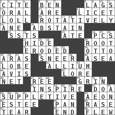 ACROSS 1. Quote 5. Benjamin's nick name 8. Falls behind 12. Of the mouth 13. "We ___ not amused" (Victoria) 14. It is permitted: Lat. 15. Hang loosely or laxly 16. Rotating or pertaining to rotation 19. One (Scot) 20. Choose not to consume 21. Fast planes 23. Had dinner 24. Personal Computers (abbr.) 27. Flintstone garb 30. Carrot, for example 31. Worn away 34. Von Bismarck 35. Caspian sea tributary 38. Scornful expression 40. Toward the sea 41. Ear part 42. Plant genus of onion and garlic 44. Advice 45. Old wives' tales, e.g. 46. Fish or hair follower 47. To sift 50. Amused look 53. Motivate 57. ___ good deed 59. Supplying deficiencies 63. A really long time 64. First name in cosmetics 65. Baking dish 66. To erase 67. Rend 68. Conclusion 69. Soared DOWN 1. Root beer relative 2. Metal shackles 3. Falsehoods 4. Pipe bend 5. Sharp remark 6. Greek god of love 7. Remaining after all deductions 8. 54 in ancient Rome 9. Adept person 10. Set 11. Filthy place 14. Actor's bit 17. Auto club (abbr.) 18. Teat (slang) 20. SW Saudi Arabia district 22. College papers 24. Cooking vessels 25. ____ d'Azur (French Riviera) 26. Portico 28. Two (Sp.) 29. Pulitzer Prize-winning author Ferber 30. Nomad 32. Snakelike fish 33. Small valley 35. Actor Alda or Thicke 36. Be footloose 37. "This won't hurt ____!" 39. River (Sp.) 43. Goad 47. Cause heat under the collar 48. Compass dir. 49. Eastern Standard Time (abbr.) 51. Perfect 52. Trap for birds or small mammals 54. Corncob 55. "Terrible" tsar 56. Tear apart 58. Afresh 59. Arrange properly for use 60. Purpose 61. Parent Teacher Association (abbr.) 62. For each 63. Sandy's bark