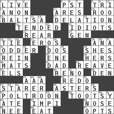ACROSS 1. Moving, as bait 5. Pacific Standard Time (abbr.) 8. Three (prefix) 11. Soon (poet.) 12. Ancient Greek god of war 13. Friend of Pooh 14. Greek mezzo-soprano Agnes 17. Conveyance 19. Looked after 21. Foolish or stupid persons 22. Stern 23. Commissioned military rank (abbr.) 24. Standoff 27. Greek god of love 29. Santa ___, CA 32. More peculiar 34. Two (Sp.) 36. "______ My Girl" (Turtles hit) 37. It's straight from the horse's mouth 38. Compass dir. 39. Possessive pronoun 40. Floor protectors 41. June honoree 42. Break or tear apart 43. Raised railways 44. Former U.S. Attorney General Janet 46. Lair 47. Auto club (abbr.) 50. Make new 52. A viewer who gazes fixedly 55. Michaelmas daisies 57. Coward 59. A girl or young woman (variant) 62. Had dinner 63. Body of Kaffir warriors 64. Characteristic smell of wine 65. Born 66. Erode 67. Elects DOWN 1. Experiment locale 2. _ tizzy (2 wds.) 3. Electrical Unit 4. Keyboard key 5. Before (prefix) 6. Major League Baseball Commissioner Bud 7. Sadhe (variant) 8. Musical group of three 9. Carrot, for example 10. Charged atoms 12. Find the sum of 15. Scornful expression 16. The sixth month of the Jewish calendar 18. Shallow baking pan 20. Worn away 24. Singer Mel 25. Standard of perfection 26. Prepares for publication 28. Echolocation 29. At or in the front 30. Impudent aggressiveness 31. NE Netherlands city 33. Followers of ems 35. Spring feasts 36. A female animal or person 42. Cowboy competition 45. Remaining after all deductions 47. Tate display 48. Nest on high 49. Scent 51. U. of Maine site 52. Connect, as a bridge 53. Haul 54. Toward shelter 55. Cuckoo 56. Cease 58. Choose 60. Fast jet (abbr.) 61. Affirmative reply