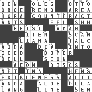 ACROSS 1. Lair 4. Cassini of fashion 8. "Beetle Bailey" pooch 12. Mitch Miller's instrument 14. San ____ (Riviera town) 15. Type of rug 16. Israeli folk dance 17. Neutralize 20. Pismires 21. Snakelike fish 22. Quiet! 23. Robbery 27. Wet nurse 29. Detail 31. Examine minutely or intensely 34. Climbing, woody, usually tropical vines 35. Baby powder 36. Opera by Verdi 39. HTML Container Element 41. To the inside or interior of 42. On the rocks 43. Drug addict 46. Small valley 47. The Jewish people; Israel 48. Period of immesurable duration 51. Flat circles 54. Fish or hair follower 56. _ tizzy (2 wds.) 58. Coop moms 61. The property of being fit to eat 66. Set down 67. Small Philippine buffalo 68. Medicinal plant 69. Water jar 70. Long (Scottish) 71. Actor's bit 72. Elected rep. DOWN 1. Capital of the state of Qatar 2. Inky black, to poets 3. Compass direction 4. The grampus (Milton) 5. Lion 6. Australian flightless bird 7. Went 8. Boat paddle 9. File 13 10. Technician 11. Pledge 13. Relaxation 18. Beverage made from leaves 19. Shade tree 24. One more than two 25. R.R. building 26. Look after 28. Having gotten out of bed 30. Women servants 32. The first octave above the treble staff 33. Non-commissioned officer (abbr.) 34. Dipping utensil 36. Assist 37. Frozen water 38. Conveyance 40. Null 44. Luau course 45. Followers of ems 49. Petroleum 50. Compass dir. 52. US Secretary of Labor Elaine L. _ 53. Makes a sale 54. Actress Patricia 55. Pulitzer Prize-winning author Ferber 57. Of or related to the anus 59. "Death on the ____" 60. Comedian Laurel of Laurel & Hardy 62. Container for groceries 63. Connecticut Ivy Leaguer 64. Boy, to dad 65. Observe