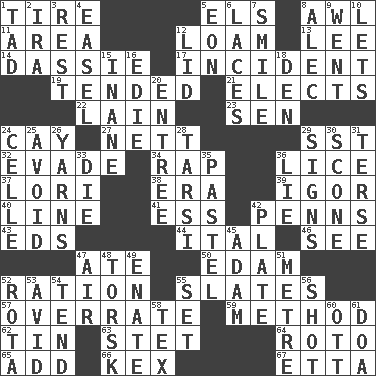 ACROSS 1. Hoop that covers a wheel 5. Raised railways 8. Leather borer 11. Length times width 12. Rich soil 13. Area sheltered from the wind 14. Small ungulate mammals of Africa 17. Event 19. Watched over 21. Opts 22. (Had) reclined 23. Elected rep. 24. Island 27. Remaining after all deductions 29. Fast jet (abbr.) 32. Dodge 34. Reproach for some lapse or misdeed 36. Louse (plural) 37. Australian parrot (variant) 38. Period 39. Russian composer Stravinsky 40. Actor's bit 41. Curvy letter 42. Actor Sean's family 43. Begley and Asner 44. Slanted text style (abbr.) 46. Perceive with the eye 47. Had dinner 50. Dutch treat 52. Food allowance for one day 55. Chalkboards 57. Make much ado about nothing 59. Mode 62. Metal container 63. Proofreading order 64. Printing process, for short 65. Find the sum of 66. A weed 67. Singer James DOWN 1. Small boy 2. Retirement account (abbr.) 3. Repose 4. Artist's stand 5. Period of immesurable duration 6. Shoestrings 7. Grin 8. Actor Baldwin 9. Gone 10. Allows 12. Flaplike covering 15. Lacking in sense or substance 16. Singer Brickell 18. Lair 20. Main course 24. Cell (Danish) 25. Keep away from 26. Entertaining tales 28. Tarsus (plural) 29. Attaches a signature 30. Biscuitlike quick bread 31. Laconic 33. Pass on 35. Soft color 36. Whopper 42. Food holder 45. First man 47. Atmosphere 48. Cod relative 49. Maternal 51. Distance measurement (Brit.) 52. Round or rotation of duties 53. Enthusiastic 54. Be inclined (to) 55. Arrange properly for use 56. Went for two points 58. John Ritter's dad 60. Baseball player Mel 61. ___ good deed