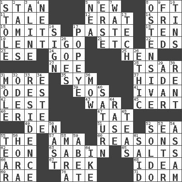 ACROSS 1. Comedian Laurel of Laurel & Hardy 5. ___ Haven, CT 8. Often (poetically) 11. Story 12. Part of Q.E.F. 14. Indian title of respect (Mr.) 15. Leaves out 17. Thick mixture 18. Nine, plus one 19. Small, flat, pigmented spot on the skin 21. And so on (abbr.) 22. Begley and Asner 23. Compass dir. 24. Republican Party 25. Layer 27. Born 28. Russian ruler of old 31. Greater amount 35. Symbol (abbr.) 37. Flintstone garb 38. Lyric poems 39. Greek goddess of the dawn 41. _ the terrible 42. For fear that 43. Armed conflict 45. Certainty 46. 4th largest of the Great Lakes 47. Make lace 49. Lair 51. Purpose 52. Ocean 55. Definite Article 57. Nanny (var.) 60. Thinks logically 62. Age 63. Unit of acoustic absorption 65. Table seasonings 66. Curve 67. Long journey 68. It may be bright or harebrained 69. Actress Charlotte 70. Had dinner 71. Dormintory (informal) DOWN 1. Took without asking 2. Domesticates 3. Place in a line 4. Remaining after all deductions 5. Teachers' org. 6. Celtic language 7. Electrical Unit 8. Clearly or manifestly demonstrative 9. Flintstone 10. Airtight sealed metal containers 13. Technical 16. Attach a signature 17. Wimpy's pal 20. Travels 26. Moral principle 29. The sixth month of the Jewish calendar 30. Monthly bill 31. Undercover agent 32. Baltic tributary 33. Home 34. First name in cosmetics 36. Cut the grass 40. Titan orbits this 44. Raze (variant) 48. Afternoon social gatherings 50. Political cartoonist Thomas 52. Twentieth part of a lira 53. Keyboard key 54. Indian state 55. Separate forcefully 56. Israeli folk dance 58. Hindu Mythology: god of death 59. Collude with 61. Expressed in words 64. Mamie's husband