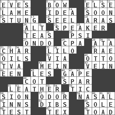 ACROSS 1. Nights before holidays 5. Arrow shooter 8. Otherwise 12. Unable to walk 13. The content of cognition 15. Within a short period 16. Feeling sharp psychological pain 18. Stitch closed the eyes of (a falcon) 19. Ancient river in northeast Turkey 20. Keyboard modifier key 22. Orator 24. Beverages made from leaves 26. Air pressure measure (abbr.) 27. Southwest Nigerian state 28. Numbers guy (abbr.) 29. "One Day ___ Time" 32. Burn to charcoal 35. _ and Stitch 37. Actress Charlotte 38. Lubricates 39. By way of 40. "Beetle Bailey" pooch 41. Federal power corp. 42. Chow _ 43. Distinctive style or manner 44. Car or cant ending 45. French article 46. Stare wonderingly 49. Small bed 50. Coast Guard woman 51. Cordwainer's material 55. Nervous spasm 56. The Jewish people; Israel 57. Aroma 59. Relating to the nose 63. Lodging establishments 64. Rights 65. Not divided or shared with others 66. Trial 67. John Ritter's dad 68. Frog relative DOWN 1. Raised railways 2. Large container 3. Australian flightless bird 4. Elected representatives 5. Twice 6. Lyric poems 7. Shed a tear 8. 1973 Nobel Price Winner (Physics) Leo 9. Old wives' tales, e.g. 10. Fly high 11. Followers of ems 14. City in Syria 17. Small, secluded valley 21. Small boy 23. White ___ sheet 25. Finds the solution 28. Rigngs loudly 29. Johnson of "Laugh-In" 30. Jacques of French films 31. Period of immesurable duration 32. ____ d'Azur (French Riviera) 33. Hub of activity 34. ____ Jay Lerner 36. One more than two 40. Cloudy 42. Mode 45. Car dealer's back yard 47. Fitting 48. Ache 49. 2nd pers. sing. pres. of can (arch.) 51. Actor's bit 52. Immeasurably long periods of time 53. Prepare for publication 54. Loose flowing garment 56. Be seated 58. Acura sports coupe 60. "Barney Miller" actor Jack 61. According to 62. Directed