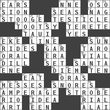 ACROSS 1. Hearing organs 5. Compass dir. 8. Bear (Spanish) 11. The Jewish people; Israel 12. Oceans 13. Tired old horse 14. Moe Howard, for one 17. One of the two male reproductive glands 19. A girl or young woman (variant) 21. Cylindrical with tapered ends 22. "Change" in Tahitian 23. Consenting reply 24. Make supply last 27. Actor's bit 29. Player for Phoenix 32. Amusement-park features 34. Slender fish 36. Edible starchy tuberous root 37. Taken by mouth 38. Period 39. Small bottle 40. Deli pickle 41. Put into a specified state 42. Before Barbara or Clara 43. Compass dir. 44. South Vietnam president (1954) 46. Nine, plus one 47. Consume 50. Mouths or openings 52. Makes clutter 55. Sounds asleep 57. Electrical Measurement 59. Disco prop 62. _ de Janeiro 63. The main thing one is thinking about 64. Monetary unit of Yemen 65. Tate display 66. Car or cant ending 67. Jai _ DOWN 1. Double-curved letter 2. Small island 3. Carrot, for example 4. Snout, nose 5. Born 6. Thoroughly unpleasant 7. First name in cosmetics 8. Single time 9. Table seasoning 10. Double curve, resembling the letter S 12. Filthy place 15. Scores awarded for successful feats 16. Needle case 18. Big collection agency 20. Scorches 24. Wear away 25. Japanese brewing company 26. Peak District village in England 28. Having ears or earlike features 29. Virtuous person 30. A salt of uric acid 31. Pitcher Ryan 33. Pipe bend 35. Food allowance for one day 36. Federal power corp. 42. Don Adams' spy role 45. Greek god of love 47. Compass dir. 48. Nest on high 49. Sadhe (variant) 51. Spanish missionary in California 52. Hindu Mythology: god of death 53. Independent ruler or chieftain 54. Specific locale 55. Ocean 56. Land 58. Commissioned military rank (abbr.) 60. Sound made by sheep 61. Connecticut Ivy Leaguer