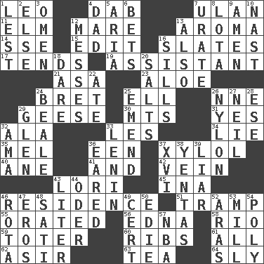 ACROSS 1. Lion 4. Small moist lump or mass 7. ____ Bator, Mongolia 11. Shade tree 12. Female horse 13. Odor 14. Compass dir. 15. Prepare for publication 16. Chalkboards 17. Looks after 19. Helper 21. White ___ sheet 23. Medicinal plant 24. Cy Young winner Saberhagen 25. Pipe bend 26. Compass dir. 29. Honkers 30. Mountains (abbr.) 31. Affirmative reply 32. Insect wing 33. French article 34. Untruth 35. Cartoonist voice _ Blanc 36. Car or cant ending 37. Xylene (variant) 40. One (Scot) 41. Also 42. Distinctive style or manner 43. Australian parrot (variant) 45. _ tizzy (2 wds.) 46. Home 51. _____ steamer (cargo ship) 55. Spoke pompously 56. Pulitzer Prize-winning author Ferber 58. _ de Janeiro 59. Carrier 60. Chest bones 61. Everything 62. SW Saudi Arabia district 63. Afternoon social gathering 64. Mischievous DOWN 1. For fear that 2. Otherwise 3. Sign of something about to happen 4. June honoree 5. Roberta Peters solo 6. Stakes 7. A salt of uric acid 8. Globular water bottle used in Asia 9. So be it 10. Political cartoonist Thomas 12. Makes clutter 13. In addition 16. Beverly of Met fame 18. Have the gumption 20. Table seasonings 22. Had dinner 24. Calif. Air Force Base 25. Make improvements or corrections to 26. High-strength synthetic material 27. Famous astronaut Armstrong 28. Compass dir. 29. Small, secluded valley 32. Housemaid (var.) 33. Soviet premier 1918-24 36. Having ears or earlike features 37. 16 38. Gossips 39. One who doesn't tell the truth 43. 61 cubic inches 44. River in Europe 46. Round or rotation of duties 47. Greek god of love 48. Suttee (variant) 49. Certainty 50. Singer Brickell 52. Caspian sea tributary 53. Place where flour is made 54. Many (prefix) 57. Basketball assoc.