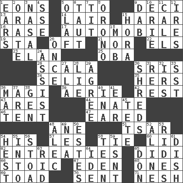 ACROSS 1. Immeasurably long periods of time 5. "Beetle Bailey" pooch 9. Tenth: prefix 13. Ancient river in northeast Turkey 14. Den 15. Ethiopian city, capital of Harari 16. Raze (variant) 17. Car 19. R.R. building 20. Often (poetically) 21. Or not 22. Raised railways 23. Liveliness 25. Chief or king in Benin or Nigeria 26. Any of the three canals of the cochlea 30. Indian titles of respect 34. Former Milwaukee Brewers owner Bud 35. Possessive pronoun 36. Wise men 39. Nest on high 42. Repose 43. Ancient Greek god of war 44. Maternal 46. Portable shelter 47. Having ears or earlike features 48. A saturated hydrocarbon 51. Russian ruler of old 54. Part of HMS, perhaps 57. French article 58. Make a knot 60. Flaplike covering 62. Pleas 65. "You Light Up My Life" star Conn 66. Unemotional 67. Locale of original sin 68. Singles 69. Frog relative 70. Transmitted 71. Tender DOWN 1. Hearing organs 2. Speak pompously 3. Rhinal 4. Compass dir. 5. Norwegian king 6. Strained 7. Teat (slang) 8. U. of Maine site 9. Pat or tap gently 10. 4th largest of the Great Lakes 11. Give a ring to 12. Angers 15. Israeli folk dance 18. Crowd into 20. Single time 24. Help 27. Insect wing 28. Whopper 29. Match 30. Fragments 31. To sift 32. Big collection agency 33. Fast jet (abbr.) 36. Floor protector 37. "We ___ not amused" (Victoria) 38. Commissioned mil. rank 40. _ tizzy (2 wds.) 41. Hearing organ 45. False hair 48. Actor Baldwin 49. Teachers' org. 50. _____ Park, CO 52. Place in a line 53. Amusement-park features 54. Behest 55. To the inside or interior of 56. Portico 58. Adolescent 59. Is not 61. Food container 63. To free from 64. Binary compound 65. Spanish title