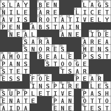ACROSS 1. Kill 5. Benjamin's nick name 8. Fails to keep up a pace 12. "Death on the ____" 13. "We ___ not amused" (Victoria) 14. It is permitted: Lat. 15. Deliberation 16. Rotating or pertaining to rotation 19. Writing instrument 20. Refrain by choice 21. Be tempered by heat 23. A saturated hydrocarbon 24. Binary compound 27. "Two Mules for Sister ____" 30. Type of rug 31. Sounds asleep 34. Not women's 35. Mine, in Marseilles 38. Calif. Air Force Base 40. Inconspicuous attention getter 41. Zero-star reviews 42. Moe Howard, for one 44. Proofreading order 45. Russian ruler of old 46. Double-curved letter 47. Enemy 50. Lightbulb-shaped fruit 53. Motivate 57. French article 59. Supplementary 63. Romantic infatuation 64. Related on the mother's side 65. Baking dish 66. "Beetle Bailey" pooch 67. Opera by Verdi 68. Compass dir. 69. Trial DOWN 1. Fastener 2. Make or become more lively 3. Place in a line 4. Affirmative reply 5. Sharp remark 6. Greek god of love 7. Remaining after all deductions 8. 54 in ancient Rome 9. Adept person 10. Set 11. Filthy place 14. Actor's bit 17. Auto club (abbr.) 18. Shallow baking pan 20. Actor Alda or Thicke 22. Help 24. Angers 25. Hiding places for outlaws 26. Compass direction 28. Director Reiner 29. Ancient Greek god of war 30. Electrical Unit 32. Erode 33. Narrow, elongated depression 35. Domed church section 36. Floor coverings 37. Washington bills 39. Greek goddess of the dawn 43. Open wide 47. Do some clerical work 48. Single 49. Eastern Standard Time (abbr.) 51. Having winglike extensions 52. Musical pauses 54. Corncob 55. "Terrible" tsar 56. French philosopher Descartes 58. Guess 59. Ocean 60. Single; one (prefix) 61. Groovy apt. 62. Parent Teacher Association (abbr.) 63. Plant holder