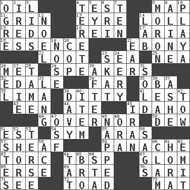ACROSS 1. Petroleum 4. Trial 8. Atlas unit 11. Smile widely 13. Jane of fiction 14. Hang loosely or laxly 15. Do over again 16. It's straight from the horse's mouth 17. Roberta Peters solo 18. Center 21. Black 22. Spoils 23. Ocean 25. Teachers' org. 26. Was introduced to 29. Orators 32. Peak District village in England 34. Distant 35. Chief or king in Benin or Nigeria 38. Pale green bean 39. Simple song 41. For fear that 43. Car or cant ending 44. Had dinner 45. Potato state 46. State head 50. Morning condensation 51. Eastern Standard Time (abbr.) 54. Symbol (abbr.) 55. Ancient river in northeast Turkey 57. To gather and bind into a bundle 59. Flamboyance 63. Torque (variant) 64. Cook's measure (abbr.) 67. Take by theft 68. Celtic language 69. Johnson of "Laugh-In" 70. Indian skirt 71. Perceive with the eye 72. Frog relative 73. Floor covering DOWN 1. Legendary monster 2. Angers 3. Flaplike coverings 4. Cigar-shaped 5. Sight organ 6. _ Lanka 7. "___ Little Indians" 8. Person of subnormal intelligence 9. Place in a line 10. Beach, in Buenos Aires 12. Christmas carol 14. Experiment locale 19. Olfactory organ 20. Police officer (slang) 21. Ewer handle 23. Three-handed card game 24. Suggestive of the supernatural 26. Cartoonist voice _ Blanc 27. Singer Brickell 28. Docile 30. Following 31. Disposed of to a purchaser 33. Long (Scottish) 36. Necklace unit 37. American tennis player Robert 39. American folk hero Crockett 40. A whole individual unit 42. Pull behind 45. SW Asia republic 47. Order of Saint Francis (abbr.) 48. Slept 49. Mouth or opening 51. _____ Park, CO 52. Dinah or Pauly 53. Laconic 56. Droops 58. Adept person 60. Dollar (slang) 61. Israeli folk dance 62. Give off 64. Make lace 65. Sis' sibling 66. R.R. building