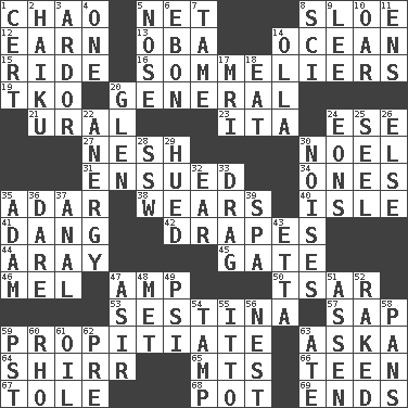 ACROSS 1. US Secretary of Labor Elaine L. _ 5. Fish or hair follower 8. _ gin 12. Merit 13. Chief or king in Benin or Nigeria 14. Sea 15. Travel on an animal 16. Wine waiters 19. Ring climax 20. Commissioned military rank 21. Mountain range 23. Call ___ day 24. Compass dir. 27. Soft 30. Christmas carol 31. Followed as a consequence or result 34. Washington bills 35. The sixth month of the Jewish calendar 38. Puts on (as clothing) 40. Small island 41. Mild oath, euphamism for damn 42. Window treatments 44. Like ___ of sunshine 45. Yard entry 46. Cartoonist voice _ Blanc 47. Electrical Unit 50. Russian ruler of old 53. French poetic form 57. Plant excrement 59. Conciliate 63. "____ silly question..." 64. Bake eggs in their shells 65. Mountains (abbr.) 66. Adolescent 67. Lacquered or enameled metalware 68. Cooking vessel 69. Conclusions DOWN 1. Certainty 2. Japanese poetic form 3. Zeal 4. Single 5. Sense of smell 6. Inky black, to poets 7. Not wild 8. _-fi 9. Area sheltered from the wind 10. Rowing implement 11. Followers of ems 14. Rounded earthenware pot or jar 17. Medical imaging device (abbr.) 18. Erode 20. Small, secluded valley 22. Disorder of the immune system 24. Immeasurably long periods of time 25. Sew up the eyelids of hawks and falcons 26. Otherwise 28. Compass dir. 29. Took on color 30. Annoying sounds 32. Hearing organ 33. To trail on the ground 35. First man 36. Have the gumption 37. Of or related to the anus 39. Health resort 43. Singer James 47. SW Saudi Arabia district 48. Was introduced to 49. 23rd letter of the Greek alphabet 51. NE Netherlands city 52. Moved through 54. Pack (down) 55. "Tell ____ the Marines!" 56. A home for chicks 58. Baking dishes 59. Pacific Standard Time (abbr.) 60. 17th letter of the Greek alphabet 61. Petroleum 62. Before (prefix) 63. Had dinner