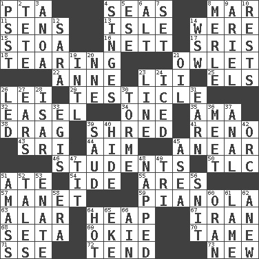 ACROSS 1. Parent Teacher Assoc. 4. Oceans 8. Spoil 11. Elected reps. 13. Capri or Wight 14. Past tense of be (plural) 15. Portico 16. Remaining after all deductions 17. Indian titles of respect 18. Rending 21. A small or young owl 22. Queen of England 1702-14 23. Cards in a Roman deck? 25. Raised railways 26. Flowery wreath 29. One of the two male reproductive glands 32. Artist's stand 34. Single 35. Nursemaid (var.) 38. To draw with force 39. Tear up 41. Former U.S. Attorney General Janet 43. Indian title of respect (Mr.) 44. Direct toward a target or goal 45. Approach 46. SAT takers 50. Affectionate concern, for short 51. Had dinner 54. Binary compound 55. Ancient Greek god of war 57. French painter Edouard 59. Player piano 63. Having or resembling wings 64. Pile 67. SW Asia republic 68. Stalk of a moss capsule 69. Migrant worker of the '30s 70. Docile 71. Compass dir. 72. Watch over 73. ___ Haven, CT DOWN 1. Inconspicuous attention getter 2. False hair 3. Small Philippine buffalo 4. Scorches 5. Compass dir. 6. Keyboard modifier key 7. Put into a specified state 8. Haggard of country music 9. Satellite of Uranus 10. Musical pauses 12. "Two Mules for Sister ____" 14. Compass dir. 19. International (abbr.) 20. Compass dir. 21. Lubricate 23. Actor's bit 24. On the rocks 26. Directed 27. Hearing organs 28. Austrian river, tributary to the Danube 30. Singer Mel 31. Merit 33. The front part of a cuirass 36. Rendezvous 37. Of or related to the anus 39. Saudi Arabian king (1953-1964) 40. Flintstone garb 42. The grampus (Milton) 45. Toward the sea 47. Teat (slang) 48. Slept 49. Three (prefix) 51. Collect or gather 52. Falsehoods 53. Related on the mother's side 56. In a ____ (agitated or irritated) 58. Epoch 60. NW Algerian seaport 61. Unable to walk 62. Afresh 64. Being at a high temperature 65. Make supply last 66. The 18th letter of the Arabic alphabet