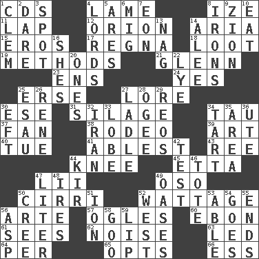ACROSS 1. Music discs 4. Unable to walk 8. Ending with capital 11. Pet locale 12. Greek mythologigal hunter 14. Roberta Peters solo 15. Greek god of love 17. Rain (Swedish) 18. Plunder 19. Modes 21. American astronaut and politician John 23. Followers of ems 24. It is so 25. Celtic language 27. Old wives' tales, e.g. 30. Compass dir. 31. Fodder prepared in a silo 34. The 19th letter of the Greek alphabet 37. Avid follower 38. Cowboy competition 39. Tate display 40. Third day of the wk. 41. Most capable 43. To sift 44. Leg joint 45. Singer James 47. Cards in a Roman deck? 49. Bear (Spanish) 50. High-altitude cloud 52. Electrical Measurement 56. Johnson of "Laugh-In" 57. Stares 60. Inky black, to poets 61. Observes 62. Annoying sound 63. Directed 64. For each 65. Chooses 66. Double-curved letter DOWN 1. To starve (Brit.) 2. Have the gumption 3. Specific locale 4. Titled peers of a realm 5. Ancient Greek god of war 6. Russian fighter aircraft 7. Age 8. Removes the wrinkles 9. The Jewish people; Israel 10. Erode 13. Tired old horse 14. Toward shelter 16. "______ My Girl" (Turtles hit) 20. Washington bills 22. Potassium hydroxide 25. He sold his birthright 26. French philosopher Descartes 27. Dipping utensil 28. Double curve, resembling the letter S 29. Vintage cars 30. Bank Draft (abbr.) 32. SW Asia republic 33. Ear part 34. Small pie 35. Length times width 36. Shoshoni 42. Trial 44. Apertif with cassis 46. Haul 47. 61 cubic inches 48. Angers 49. Fertile tracts in a desert 50. Algonquian 51. Electrically charged atom 52. Compass direction 53. Competent 54. Moves 55. Conclusions 56. Viper 58. Thick or sticky substance 59. Mouth edge