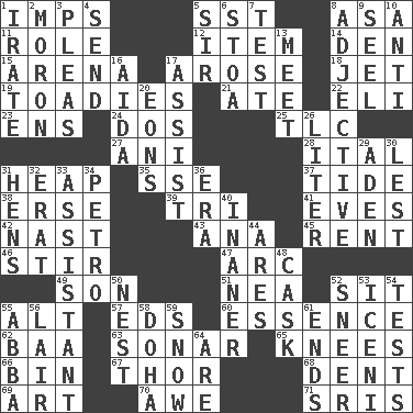 ACROSS 1. Naughty children 5. Fast jet (abbr.) 8. White ___ sheet 11. Hero or heavy, e.g. 12. Detail 14. Lair 15. Sports stadium 17. Came up 18. Passenger plane 19. Sycophants 21. Had dinner 22. Connecticut Ivy Leaguer 23. Followers of ems 24. Two (Sp.) 25. Affectionate concern, for short 27. Black tropical American cuckoo 28. Slanted text style (abbr.) 31. Pile 35. Compass dir. 37. Event that recurs at intervals 38. Celtic language 39. Three (prefix) 41. Nights before holidays 42. Political cartoonist Thomas 43. Santa ___, CA 45. Monthly bill 46. Commotion 47. Curve 49. Male offspring 51. Teachers' org. 52. Be seated 55. Keyboard modifier key 57. Begley and Asner 60. Core 62. Sound made by sheep 63. Underwater navigation system 65. Leg joints 66. Storage container 67. Son of Odin 68. Gouge 69. Tate display 70. Deep reverence 71. Indian titles of respect DOWN 1. Feeling or showing extreme anger 2. Person of subnormal intelligence 3. Entreaties 4. Post 5. Title for a knight 6. Portico 7. Trial 8. Descriptive word 9. Stitch closed the eyes of (a falcon) 10. Against 13. Confront 16. Opera by Verdi 17. Help 20. Immeasurably long periods of time 26. 61 cubic inches 29. Arabian gulf 30. For fear that 31. Coop moms 32. Part of Q.E.F. 33. Helper 34. Stone: prefix 36. Epoch 40. More empty; more void 44. Ancient Greek god of war 48. Keg 50. Egg locale 52. Contemptuous expression 53. Ancient Celtic tribe of eastern Britain 54. Trials 55. Swedish rock group 56. Den 58. Capital of the state of Qatar 59. Frozen precipitation 61. Conclusions 64. "We ___ not amused" (Victoria)