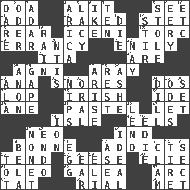 ACROSS 1. ___ good deed 4. Came down and settled, as after flight 8. Observe 11. Find the sum of 12. Moved through 14. Proofreading order 15. Hitchcock's "____ Window" 17. Ancient Celtic tribe of eastern Britain 18. Torque (variant) 19. The state or an instance of erring 21. Poet Dickinson 23. Call ___ day 24. "We ___ not amused" (Victoria) 25. Hindu god of fire 27. Like ___ of sunshine 30. Santa ___, CA 31. Sounds asleep 34. Two (Sp.) 37. Chop off 38. From or relating to Ireland 39. Binary compound 40. A saturated hydrocarbon 41. Soft color 43. Allow 44. Capri or Wight 45. Snakelike fish 47. Modern: prefix 49. Working for oneself (abbr.) 50. Maid-servant 52. Inveterate users 56. Be inclined (to) 57. Honkers 60. Writer Wiesel 61. Butter sub 62. An organ shaped like a helmet 63. Curve 64. Make lace 65. Monetary unit of Yemen 66. Was introduced to DOWN 1. Have the gumption 2. Baltic tributary 3. The sixth month of the Jewish calendar 4. N. Chile seaport 5. Made of lace 6. Mamie's mate 7. Nine, plus one 8. Fur scarf 9. Suggestive of the supernatural 10. And so on (abbr.) 13. Pass on 14. Disorderly outburst 16. Water falling in drops from the sky 20. Nuclear Threat Initiatives 22. Fifth month 25. Soon (poet.) 26. Stare wonderingly 27. Ascend 28. State of inaction 29. American tennis player Robert 30. According to 32. Pinches, bites 33. Of the mouth 34. Deli pickle 35. Lyric poems 36. Arrange properly for use 42. Grant temporary use of 44. Electrically charged atom 46. Singer Brickell 47. Music written for nine 48. Inside; within (prefix) 49. Standard of perfection 50. Actor Lugosi 51. Ovum 52. At sea 53. Burrowing marine mollusk 54. Become fatigued 55. Religious group 56. Small child 58. Hearing organ 59. Biblical high priest