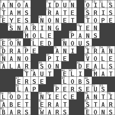 ACROSS 1. Small Philippine buffalo 5. Goddess of spring and wife of Bragi 9. Petroleums 13. Scottish caps 14. Assign a rank or rating to 15. Indian titles of respect 16. Snake ____ (dice throw) 17. Music written for nine 18. Drink excessively 19. Catching in a trap 21. Nine, plus one 22. Undercover agent 23. Baking dishes 24. Age 27. Directed 28. Horse sense 29. Window treatment 31. Cuckoo 32. SW Asia republic 36. Billionth: prefix 37. Sliced dessert 38. Short-tailed, large-bodied rat 39. Having or resembling wings 40. Boy, to dad 41. Allots cards 42. Strained 44. Biblical high priest 46. Floor covering 47. Celtic language 48. Tennis shots 50. Infant locale 51. Son of Zeus who helped slay Medusa 54. Farming town in central California 56. Sibling's daughter 58. Against 60. Collude with 61. Part of Q.E.F. 62. Play the lead 63. Oblong pieces of solid material 64. Armed conflicts 65. Immeasurably long periods of time DOWN 1. Had dinner 2. Negative votes 3. Sign of something about to happen 4. Indian state 5. Pressed 6. Mild oath, euphamism for damn 7. Shoshoni 8. Fish or hair follower 9. Clearly or manifestly demonstrative 10. Removes the wrinkles 11. Mouth edge 12. Compass dir. 17. "Death on the ____" 20. Hero or heavy, e.g. 21. The 19th letter of the Greek alphabet 23. Luau course 24. Pulitzer Prize-winning author Ferber 25. Relating to the mouth 26. Grandmother 28. Compass dir. 30. Likenesses of persons 31. The 18th letter of the Arabic alphabet 33. Wander aimlessly 34. Silent film actress Nazimova 35. A home for chicks 37. Plant holder 40. Institute legal proceedings 41. Claim 43. Cleo's killer 44. Chooses 45. Old wives' tales, e.g. 47. A person who is older than you are 49. Gospel singer Marvin 51. Lightbulb-shaped fruit 52. To (old English) 53. Comedian Laurel of Laurel & Hardy 54. Experiment locale 55. Chief or king in Benin or Nigeria 56. ___ Haven, CT 57. Retirement account (abbr.) 59. Big collection agency