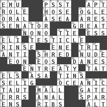 ACROSS 1. Australian flightless bird 4. Inconspicuous attention getter 8. Fitting 11. Hero or heavy, e.g. 13. Flexible conduit 14. Stare at amorously 15. Spoken 16. At sea 17. Ancient Greek god of war 18. Elected representative 21. Relatively large 22. Words to Nanette 23. Neckwear 25. Curvy letter 26. Biblical high priest 29. A testis 32. Remove soap 34. Compass dir. 35. Three (prefix) 38. Against 39. Tear up 41. Naked 43. A really long time 44. Greek goddess of the dawn 45. Natives or inhabitants of Denmark 46. Plea 50. Make lace 51. Raised railways 54. White ___ sheet 55. Airtight sealed metal containers 57. Major League Baseball Commissioner Bud 59. Pertaining to the sea 63. Drawn tight 64. Shopping center 67. Yard entry 68. Blunders 69. Of or related to the anus 70. Coast Guard woman 71. Followers of ems 72. Chest bones 73. The first octave above the treble staff DOWN 1. Greek god of love 2. Greater amount 3. Uhlan (variant) 4. N Egypt peninsula 5. Distress signal 6. Compass dir. 7. Afternoon social gathering 8. Match 9. Entreaties 10. Trials 12. Flair 14. Rowing implement 19. Haul 20. Single 21. Set 23. Prong on a fork 24. On the rocks 26. Period 27. Actor's bit 28. To the inside or interior of 30. Laconic 31. Inactive volcano in Sicily 33. Trig term 36. The smallest animal of a litter 37. It may be bright or harebrained 39. Puts into a specified state 40. Israeli folk dance 42. Eastern Standard Time (abbr.) 45. Centimeter-gram-second unit of force 47. Tired old horse 48. Ringlike coral islands and reefs 49. Nervous spasm 51. First name in cosmetics 52. Acquire or gain knowledge or skills 53. Disparaging remarks 56. Sinks 58. It is 60. California wine valley 61. Slanted text style (abbr.) 62. An absolute certainty 64. Impair 65. Cuckoo 66. Experiment locale