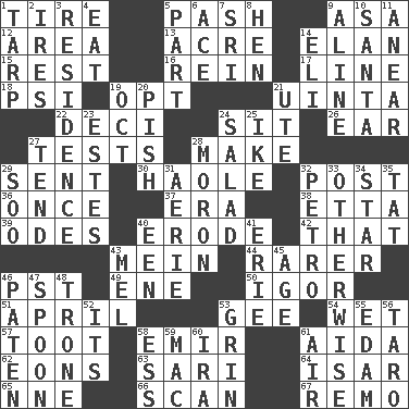 ACROSS 1. Hoop that covers a wheel 5. Romantic infatuation 9. White ___ sheet 12. Length times width 13. 43,560 square feet 14. Flair 15. Relief 16. It's straight from the horse's mouth 17. Actor's bit 18. Air pressure measure (abbr.) 19. Elect 21. National forest in Provo, Utah 22. Tenth: prefix 24. Be seated 26. Hearing organ 27. Trials 28. Cause to be 29. Transmitted 30. White Person, in Hawaii 32. Mail 36. At one time in the past 37. Period 38. Singer James 39. Lyric poems 40. Eat (away) 42. Not this but _ 43. Chow _ 44. Less widely known 46. Pacific Standard Time (abbr.) 49. Compass dir. 50. Composer Stravinsky 51. Showery time 53. Unit of force equal to gravity 54. Soggy 57. A blast of a horn 58. Independent ruler or chieftain 61. Opera by Verdi 62. Immeasurably long periods of time 63. Indian skirt 64. Austrian river, tributary to the Danube 65. Compass dir. 66. Skim 67. San ____ (Riviera town) DOWN 1. Canvas cover 2. Angers 3. Home 4. Ingest 5. Role in a play 6. Adept person 7. _ Lanka 8. Layer 9. Place in a line 10. Before Barbara or Clara 11. Approach 14. Biblical high priest 19. Sep. follower 20. Expression of disdain 21. Shoshoni 23. _____ Park, CO 24. First course 25. Eisenhower's nickname 27. Be inclined (to) 28. Person of subnormal intelligence 29. "Barney Miller" actor Jack 31. Nest on high 32. Stone: prefix 33. Else 34. Play the lead 35. Make lace 40. Car or cant ending 41. 4th largest of the Great Lakes 43. Cartoonist voice _ Blanc 45. Grow older 46. Eucharist need 47. Soup utensil 48. Heavy duty weighing machine 52. It is 53. Broad smile 55. Dutch treat 56. Edible starchy tuberous root 58. Curvy letter 59. Apple computer (short form) 60. Lyricist Gershwin 61. Atmosphere