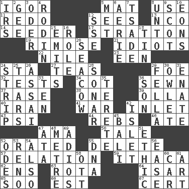 ACROSS 1. Russian composer Stravinsky 5. Floor covering 8. Purpose 11. Do over again 12. Observes 13. Non-commissioned officer (abbr.) 14. Sowing specialist 17. Ski resort town in Vermont 19. Full of chinks, cracks, or crevices 21. Foolish or stupid persons 22. "Death on the ____" 23. Car or cant ending 24. R.R. building 27. Beverages made from leaves 29. Enemy 32. Trials 34. Small bed 36. Stitched 37. Raze (variant) 38. Single 39. Spanish pot 40. SW Asia republic 41. Armed conflict 42. An arm off of a larger body of water 43. 23rd letter of the Greek alphabet 44. Confederate soldiers (slang) 46. Had dinner 47. Wet nurse (var.) 50. Story 52. Spoke pompously 55. Erase 57. Accusation by an informer 59. New York city 62. Followers of ems 63. Round or rotation of duties 64. Austrian river, tributary to the Danube 65. "Barney Miller" actor Jack 66. Eastern Standard Time (abbr.) 67. Sure thing DOWN 1. Big collection agency 2. Unit of force equal to gravity 3. River in Europe 4. "The Thinker" sculptor 5. Was introduced to 6. Nest on high 7. Sadhe (variant) 8. To (old English) 9. Highlander 10. Immeasurably long periods of time 12. Compass dir. 15. Sends forth 16. Hero or heavy, e.g. 18. Metal container 20. Manatee 24. Long narrow piece of something 25. Pulls into pieces 26. Slender Brazilian palm 28. Echolocation 29. Chap (slang) 30. A small or young owl 31. Maternal 33. Nine, plus one 35. Cylindrical with tapered ends 36. Manchild 42. Small island 45. Indonesian resort city 47. _ moment's notice (2 wds.) 48. Distance measurement (Brit.) 49. Goodbye (Sp.) 51. Moral principle 52. Lyric poems 53. Western Nevada city 54. In addition 55. Heredity factor (abbr.) 56. Comfort 58. Baseball player Mel 60. Auto 61. Tate display