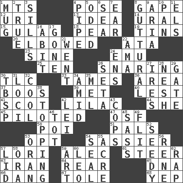 ACROSS 1. Mountains (abbr.) 4. Introduce or present, as a question 8. Yawn 12. RI univ. 13. It may be bright or harebrained 14. Mountain range 15. Russian prison camp 18. Lightbulb-shaped fruit 19. Metal containers 20. Shoved, as through a crowd 22. "One Day ___ Time" 23. Trig term 24. Australian flightless bird 25. "___ Little Indians" 26. Catching in a trap 30. Affectionate concern, for short 33. Softens 36. Type of rug 37. Scornful sounds 39. Was introduced to 40. For fear that 41. Highlander 42. Pale purple color 44. A female animal or person 45. Manned the helm 47. Order of Saint Francis (abbr.) 50. Luau course 51. Friends 53. Choose 54. More disrespectful 57. Australian parrot (variant) 59. Actor Baldwin 61. Navigate 63. SW Asia republic 64. Bring up, as a child 65. Heredity factor (abbr.) 66. Mild oath, euphamism for damn 67. Lacquered or enameled metalware 68. Slangy assent DOWN 1. Large cup 2. Loyal 3. Beverly of Met fame 4. Corncob 5. Wrote a lyric poem 6. Ocean 7. Ewer handle 8. From the throat 9. Operatic vocal solo 10. Baking dish 11. Raised railways 16. "This won't hurt ____!" 17. Went 21. Left 22. Nursemaid (var.) 24. Followers of ems 26. Stalk of a moss capsule 27. Angers 28. Soft 29. Yard entry 30. Cook's measure (abbr.) 31. Locales 32. Calm and collected 34. Among 35. Cartoonist voice _ Blanc 38. Ceasing 42. Luau accessory 43. 911 reaches them 46. Small child 48. Backtalk 49. Sudden quick movement 52. Sleazy 53. NW Algerian seaport 54. Lick closed 55. 43,560 square feet 56. French philosopher Descartes 57. Flaplike covering 58. Mouth or opening 59. Tate display 60. Lion 62. Hit sharply and swiftly
