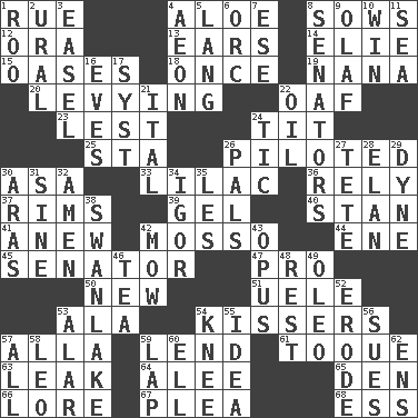 ACROSS 1. Sorrow 4. Medicinal plant 8. Sty mamas 12. Mouth or opening 13. Hearing organs 14. Writer Wiesel 15. Fertile tracts in a desert 18. Single time 19. Grandmother 20. Imposing or collecting, as a tax 22. Clumsy lout 23. For fear that 24. Teat (slang) 25. R.R. building 26. Manned the helm 30. White ___ sheet 33. Pale purple color 36. Trust 37. Basketball hoops 39. Set 40. Comedian Laurel of Laurel & Hardy 41. Afresh 42. With motion or animation 44. Compass dir. 45. Elected representative 47. Adept person 50. ___ Haven, CT 51. Ubangi River tributary 53. According to 54. Smoochers 57. Silent film actress Nazimova 59. Grant temporary use of 61. Woman's close-fitting hat 63. Path through which fluid escapes 64. Toward shelter 65. Lair 66. Old wives' tales, e.g. 67. Entreaty 68. Double-curved letter DOWN 1. Friend of Pooh 2. Mountain range 3. Artist's stand 4. A really long time 5. Long (Scottish) 6. The grampus (Milton) 7. Compass dir. 8. Elected representatives 9. Norwegian king 10. Victory 11. Ocean 16. Nights before holidays 17. System (abbr.) 21. Slanted text style (abbr.) 22. Lubricate 24. Nervous spasm 26. Friends 27. False hair 28. Style 29. Unit of force 30. Ancient river in northeast Turkey 31. Trig term 32. So be it 34. Russian composer Stravinsky 35. French article 38. Tchaikovsky ballet 42. Cut the grass 43. Musical composition 46. Beverage made from leaves 48. Take ten 49. Margarine 52. Eat (away) 53. Having or resembling wings 54. Leg joint 55. The main thing one is thinking about 56. Institutes legal proceedings 57. Everything 58. Lion 59. Pet locale 60. Pipe bend 62. Followers of ems