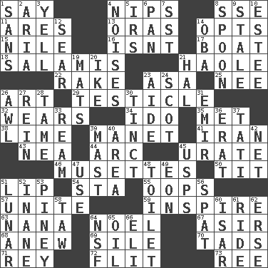 ACROSS 1. Declare 4. Pinches, bites 8. Compass dir. 11. Ancient Greek god of war 13. Mouths or openings 14. Chooses 15. The longest river in the world 16. Is not 17. Water vessel 18. Deli grouping 21. White Person, in Hawaii 22. Immoral or dissolute person 23. White ___ sheet 25. Born 26. Nonscientific branch of learning 29. One of the two male reproductive glands 32. Erodes 34. Wedding promise 35. Was introduced to 38. Welles in "The Third Man" 39. French painter Edouard 41. SW Asia republic 43. Teachers' org. 44. Curve 45. A salt of uric acid 46. French bagpipes 50. Teat (slang) 51. Mouth edge 54. R.R. building 55. I made a mistake 57. Join together 59. Motivate 63. Grandmother 64. Christmas carol 67. SW Saudi Arabia district 68. Afresh 69. Drop; flow; fall 70. Small boys 71. Marina Del _, California 72. Sudden quick movement 73. To sift DOWN 1. Without 2. Operatic vocal solo 3. Shout 4. Annoying sounds 5. Big collection agency 6. Baking dish 7. Fast jet (abbr.) 8. Soup utensil 9. Showing deterioration from age 10. First name in cosmetics 12. Singe 14. Chief or king in Benin or Nigeria 19. Floor protectors 20. Eisenhower's nickname 21. Actor Linden 23. Helper 24. Highlander 26. Leather borer 27. It's straight from the horse's mouth 28. Docile 30. A color or tint 31. Arab leader 33. 480, 500 or 516 sheets of paper 36. Part of Q.E.F. 37. Jacques of French films 39. Vertical spar for supporting sails 40. Length times width 42. Fish or hair follower 45. United States Postal Service (abbr.) 47. Purpose 48. Rest room 49. A really long time 51. Type of eclipse 52. Lacking in sense or substance 53. Abounding in pines 56. Petty quarrel 58. The 23rd letter of the Hebrew alphabet 60. Austrian river, tributary to the Danube 61. Travel on or in a vehicle 62. Celtic language 64. Science/research agcy. 65. Petroleum 66. Biblical high priest