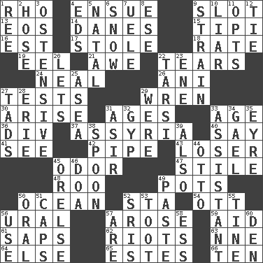 ACROSS 1. 17th letter of the Greek alphabet 4. Follow as a consequence or result 9. Notch 13. Greek goddess of the dawn 14. Natives or inhabitants of Denmark 15. Native american tent (variation) 16. Eastern Standard Time (abbr.) 17. Fur scarf 18. Assign a rank or rating to 19. Snakelike fish 21. Deep reverence 22. Lacerates 24. Actress Patricia 26. Cuckoo 27. Trials 29. Songbird 30. Originate 31. Grows older 33. Ripen 36. HTML Container Element 37. Nineveh was its capital 40. Declare 41. Observe 42. Corncob 43. Failure 45. Aroma 47. Vertical member of a panel or frame 48. Friend of Pooh 49. Plant holders 50. Sea 52. R.R. building 54. Baseball player Mel 56. Mountain range 57. Came up 59. Help 61. Plant excrements 62. Debaucheries 63. Compass dir. 64. Otherwise 65. _____ Park, CO 66. "___ Little Indians" DOWN 1. To sift 2. Stockings 3. Clearly or manifestly demonstrative 4. Begley and Asner 5. Relating to or accompanying birth 6. Frozen precipitation 7. Ubangi River tributary 8. Compass dir. 9. Put through a sieve 10. One who doesn't tell the truth 11. Elects 12. Make a knot 20. Allows 22. Tarsus (plural) 23. Compass dir. 25. Toward the sea 27. Small boys 28. 4th largest of the Great Lakes 29. Past tense of be (plural) 31. SW Saudi Arabia district 32. Hustle 33. Helper 34. Highlander 35. Jane of fiction 38. Soup utensil 39. In addition 44. Von Bismarck 45. Threatening words 46. ___ good deed 49. Thick mixture 50. Relating to the mouth 51. Balmoral and tarboosh 52. Indian titles of respect 53. A blast of a horn 55. Prong on a fork 56. Purpose 57. "We ___ not amused" (Victoria) 58. Double-curved letter 60. Lair