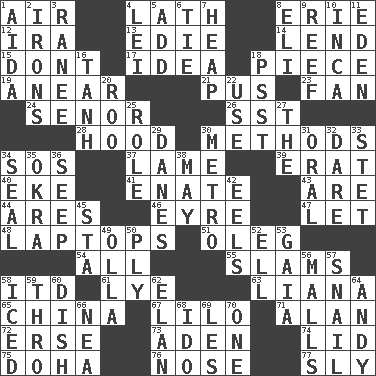 ACROSS 1. Atmosphere 4. Thin strip of wood or metal 8. One of the Great Lakes 12. Lyricist Gershwin 13. Singer Brickell 14. Grant temporary use of 15. Do not 17. The content of cognition 18. Component 19. Approach 21. Fluid product of inflammation 23. Air blower 24. Sir (Sp.) 26. Fast jet (abbr.) 28. Parka part 30. Modes 34. Distress signal 37. Unable to walk 39. Part of Q.E.F. 40. Make supply last 41. Related on the mother's side 43. "We ___ not amused" (Victoria) 44. Ancient Greek god of war 46. Jane of fiction 47. Allow 48. Portable computers 51. Cassini of fashion 54. Everything 55. Shuts with force 58. It would 61. Potassium hydroxide 63. Woody, climbing, usually tropical plant 65. Large country 67. _ and Stitch 71. ____ Jay Lerner 72. Celtic language 73. An important port of Yemen 74. Flaplike covering 75. Capital of the state of Qatar 76. Olfactory organ 77. Secret DOWN 1. Opera by Verdi 2. Removes the wrinkles 3. The wife of a rajah (variant) 4. Flowery wreath 5. Find the sum of 6. Standoff 7. Pile 8. Biblical high priest 9. Coral collection 10. South American Indian 11. Locale of original sin 16. Hyperbolic tangent 18. Inconspicuous attention getter 20. Friend of Pooh 22. Purpose 25. Hero or heavy, e.g. 27. Definite Article 29. Natives or inhabitants of Denmark 30. Paris' subway 31. Of the mouth 32. Have the gumption 33. Proofreading order 34. Lick closed 35. Gumbo ingredient 36. Ooze 38. Fifth month 42. Snakelike fish 45. R.R. building 49. Water jar 50. Strand of rope, yarn or thread 52. Pipe bend 53. Greek goddess of the earth (variant) 56. Promenades 57. Slow-paced one 58. On the rocks 59. Through, poetically 60. Food container 62. Style 64. Actor Griffith 66. Teachers' org. 68. Wedding promise 69. French article 70. Single