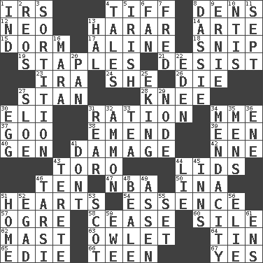 ACROSS 1. Big collection agency 4. Small quarrel 8. Hiding places for outlaws 12. Modern: prefix 13. Ethiopian city, capital of Harari 14. Johnson of "Laugh-In" 15. Dormintory (informal) 17. Place in a line 18. Sever or remove by pinching or nipping 19. Paper fasteners 21. Stop 23. Retirement account (abbr.) 24. A female animal or person 26. Pass on 27. Comedian Laurel of Laurel & Hardy 28. Leg joint 30. Connecticut Ivy Leaguer 31. Food allowance for one day 34. Madame (abbr.) 37. Thick or sticky substance 38. Make improvements or corrections to 39. Car or cant ending 40. Commissioned military rank (abbr.) 41. Break 42. Compass dir. 43. "Corrida" creature 44. Hats (slang) 46. Nine, plus one 47. Basketball assoc. 50. _ tizzy (2 wds.) 51. Centers 54. Core 57. Legendary monster 58. Desist 60. Filth; sediment 62. Vertical spar for supporting sails 63. A small or young owl 64. Shallow baking pan 65. Singer Brickell 66. Adolescent 67. Consenting reply DOWN 1. Working for oneself (abbr.) 2. Vintage cars 3. Conclusion 4. Stories 5. From or relating to Ireland 6. Avid follower 7. Flintstone 8. Small ungulate mammals of Africa 9. Bert's buddy 10. Nuclear Threat Initiatives 11. Back-to-school mo. 13. Actor Linden 16. Hindu Mythology: god of death 20. Baking dish 22. Locale of original sin 25. Supplementing with great effort 27. _ gin 29. Thickened enlargement 30. Oval reproductive body of a fowl 31. Stern 32. ID or VA city 33. Afternoon social gathering 34. Ananias' fault 35. Not women's 36. Compass dir. 41. Do not 43. Cigar-shaped 44. Falsehood 45. Lodging establishments 46. Tarsus (plural) 48. Memphis, Tenn. Street 49. NE Netherlands city 51. Residence 52. Mild oath 53. Native of Scotland 55. Arrange properly for use 56. Writer Wiesel 59. She-sheep 61. Followers of ems