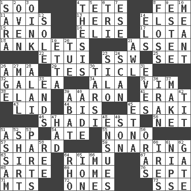 ACROSS 1. "Barney Miller" actor Jack 4. Wig 8. Opposite of masc. 11. Deliberation 13. Possessive pronoun 14. Otherwise 15. Western Nevada city 16. Writer Wiesel 17. Globular water bottle used in Asia 18. Short socks 21. NE Netherlands city 22. Needle case 23. Compass dir. 25. Arrange properly for use 26. Nanny (var.) 29. One of the two male reproductive glands 32. An organ shaped like a helmet 34. Chicken ___ king 35. Zeal 38. Flair 39. Composer Copland 41. Part of Q.E.F. 43. Hat (slang) 44. Twice 45. 1973 Nobel Price Winner (Physics) Leo 46. Most questionable 50. Fish or hair follower 51. Viper 54. Had dinner 55. Words to Nanette 57. Broken piece 59. Catching in a trap 63. The founder of a family 64. Tall New Zealand timber tree 67. Roberta Peters solo 68. Johnson of "Laugh-In" 69. Dwelling 70. Back-to-school mo. 71. Mountains (abbr.) 72. Singles 73. Compass dir. DOWN 1. "Two Mules for Sister ____" 2. Baking chamber 3. Pig sound 4. College paper 5. Snakelike fish 6. Three (prefix) 7. Compass dir. 8. Soft thread for cleaning between teeth 9. First name in cosmetics 10. Intended 12. Not divided or shared with others 14. Raised railways 19. Singer James 20. Third day of the wk. 21. Leather borer 23. Grain storage tower 24. Examine minutely or intensely 26. Mature 27. Shopping center 28. Mountain range southwest of Kyrgyzstan 30. Tarsus (plural) 31. Nights before holidays 33. Conclusions 36. SW Asia republic 37. Cause to be 39. Blind as ____ 40. Helper 42. Teat (slang) 45. Inactive volcano in Sicily 47. Possessed 48. Follows as a consequence or result 49. Male offspring 51. Indian state 52. Upper-body garment 53. Pieces 56. Mouths or openings 58. To riddle 60. Angers 61. Cuts off 62. Yard entry 64. 17th letter of the Greek alphabet 65. Electrically charged atom 66. Madame (abbr.)