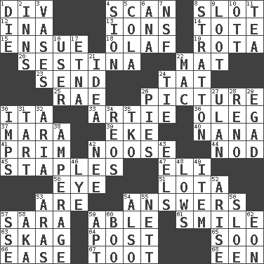ACROSS 1. HTML Container Element 4. Examine minutely or intensely 8. Narrow opening 12. _ tizzy (2 wds.) 13. Charged particles 14. Haul 15. Take place subsequently 18. Norwegian king 19. Roll call or roster of names 20. French poetic form 22. Floor covering 23. Post 24. Make lace 25. Actress Charlotte 26. Photo 30. Call ___ day 33. Nick name for Arthur 36. Cassini of fashion 37. Hindu Mythology: god of death 39. Make supply last 40. Nanny 41. Demure 42. Trap for birds or small mammals 44. Lower and raise head in agreement 45. Paper fasteners 47. Connecticut Ivy Leaguer 50. Sight organ 51. Globular water bottle used in Asia 53. "We ___ not amused" (Victoria) 54. Replies (to) 57. "Two Mules for Sister ____" 59. Competent 61. Grin 63. Heroin 64. Mail 65. "Barney Miller" actor Jack 66. Relaxation 67. A blast of a horn 68. Car or cant ending DOWN 1. Expire 2. Taverns 3. Flower holders 4. The Jewish people; Israel 5. Root beer relative 6. Santa ___, CA 7. Science/research agcy. 8. Ski resort town in Vermont 9. Spoils 10. Baseball player Mel 11. Afternoon social gathering 16. One who makes use of a thing 17. Inactive volcano in Sicily 21. The main thing one is thinking about 22. Apple computer (short form) 24. Standoff 26. Sliced desserts 27. ____ Bator 28. Former U.S. Attorney General Janet 29. Mild oath 30. Naughty children 31. Small pie 32. Operatic vocal solo 34. Vintage cars 35. Ring climax 38. Electrical Measurement 42. Born 43. Snakelike fish 46. Potassium hydroxide 48. Moos 49. A whole individual unit 52. Get up 53. Caspian sea tributary 54. In addition 55. Remaining after all deductions 56. A type of plum 57. Compass dir. 58. Alias (abbr.) 59. Fitting 60. Surprise greeting 62. Age